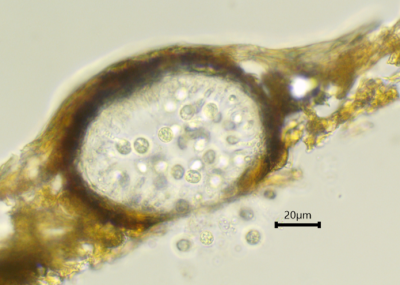 まめちしき:褐色円斑病に感染したツタは街中でもよく見かけられます。顕微鏡写真は分生子殻を薄く切断し、横から観察したものです。壺のような形をしていて、内部に分生子が入っているようすが分かるかと思います。