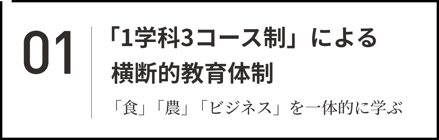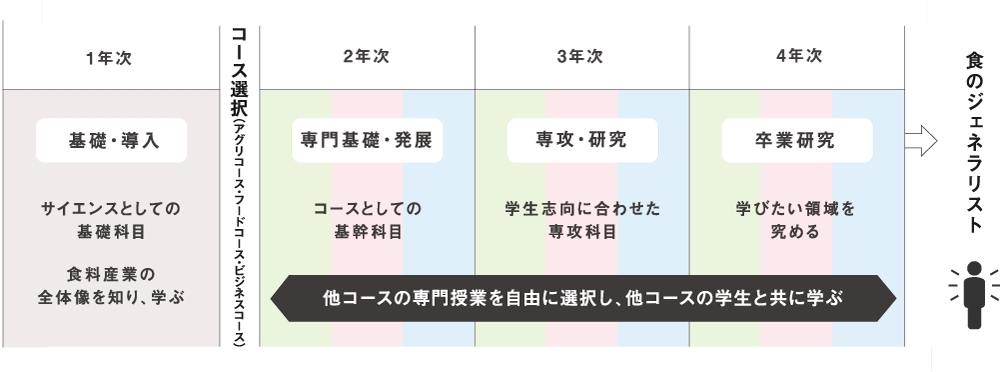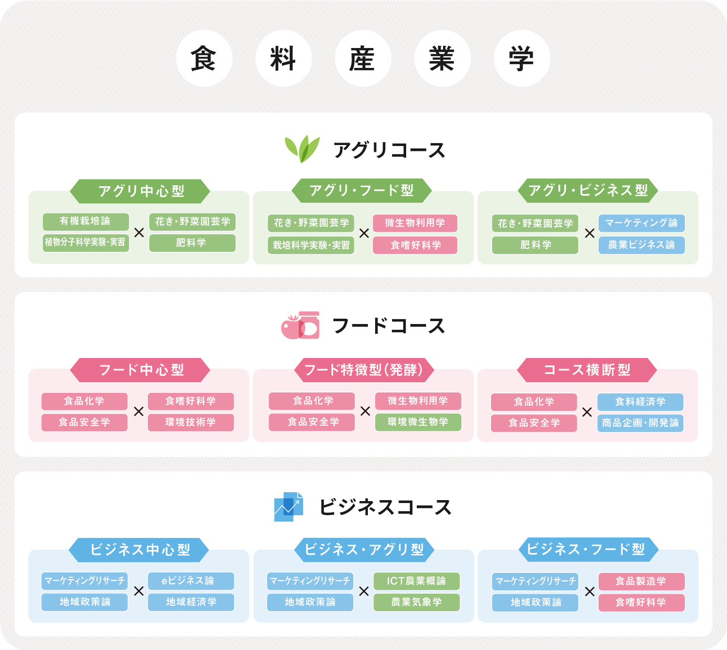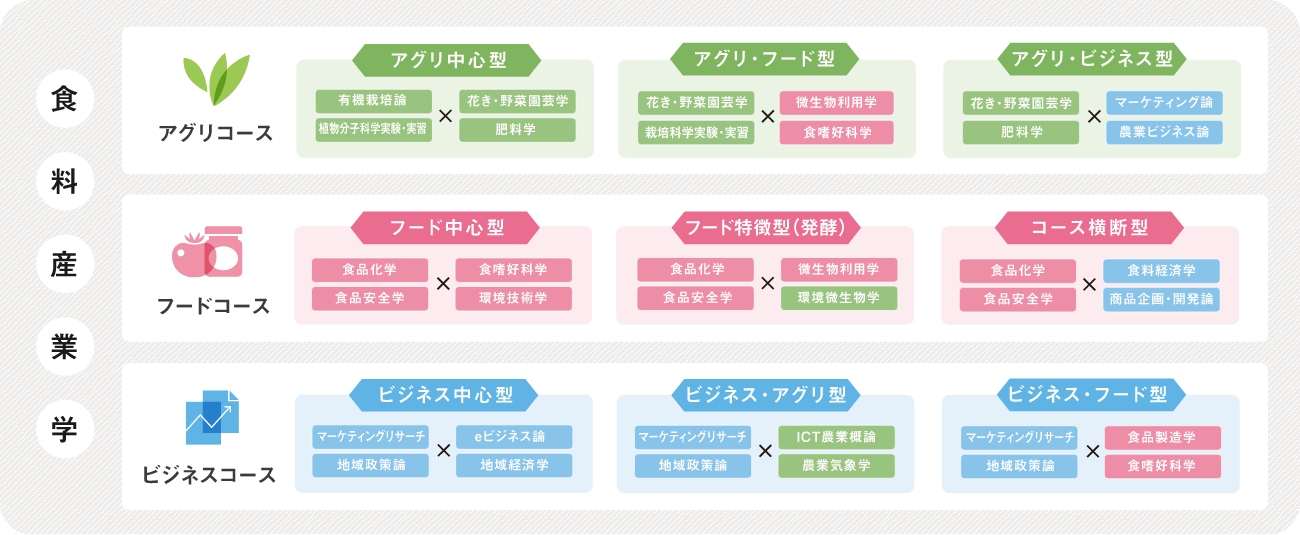 2年次からは「アグリコース」「フードコース」「ビジネスコース」の3つのコースに分かれて、専門知識と技術を修得します。また、コース横断的履修により、どのコースに配属されても自分の将来や目標に合わせて、科目の履修が可能です。