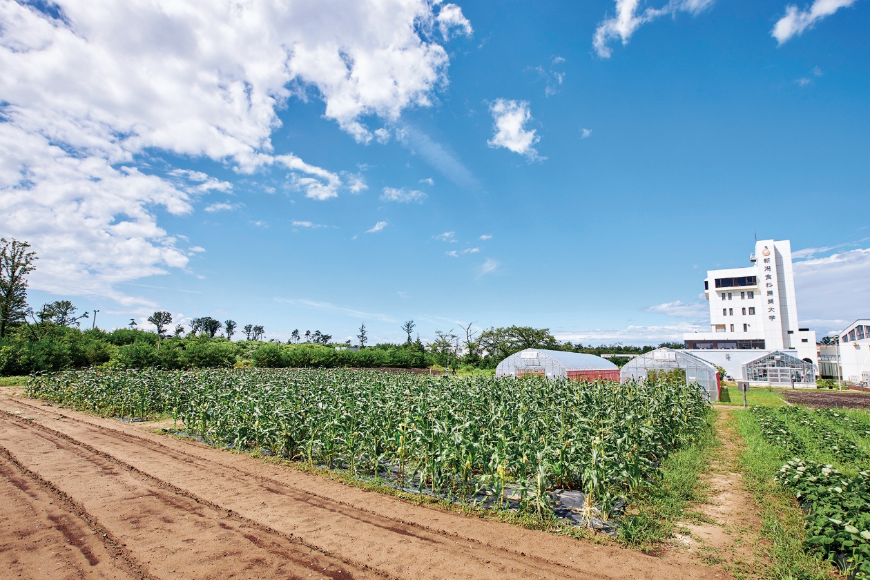 また、胎内キャンパス内には圃場やビニールハウス、ガラス温室などもあるため、学外へ移動することなく学内で作物を育成することができ、スムーズな実習・研究が可能です。