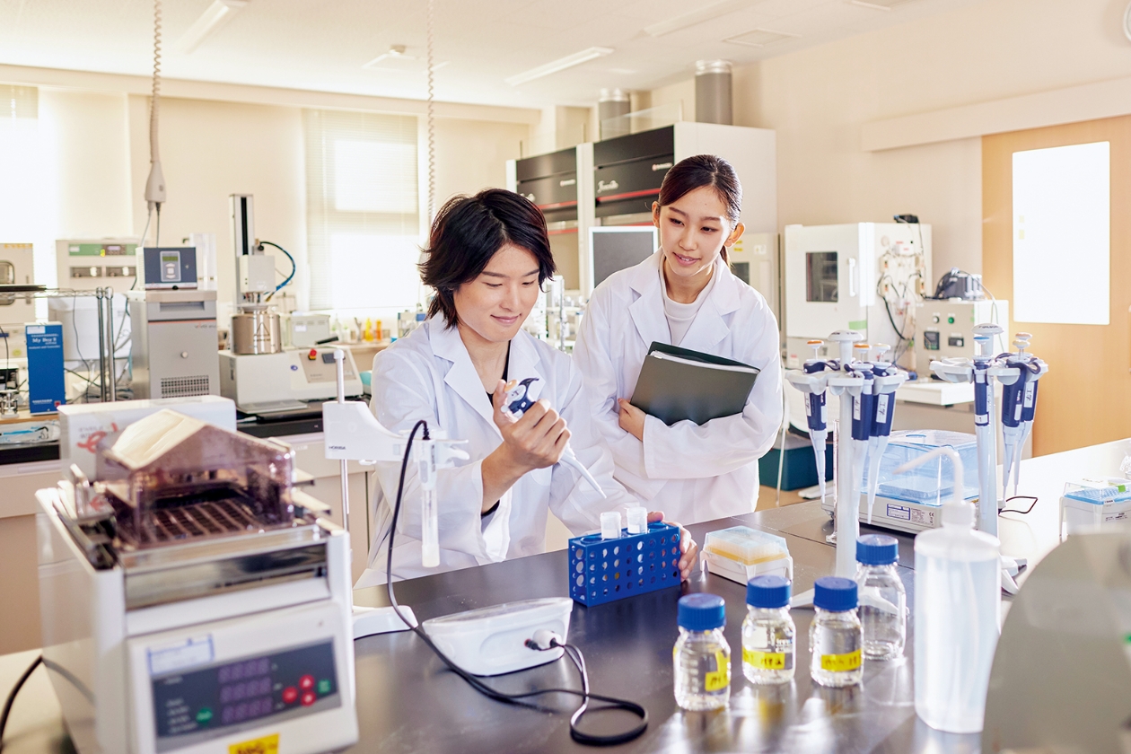 1年次前期に、「数学入門」「生物学入門」「化学入門」「物理学入門」、後期には「生物学の基礎」「化学の基礎」を開講し、高校時代に苦手だった科目や未履修科目を早い段階で克服することで、コースでの専門科目の学びをスムーズにします。