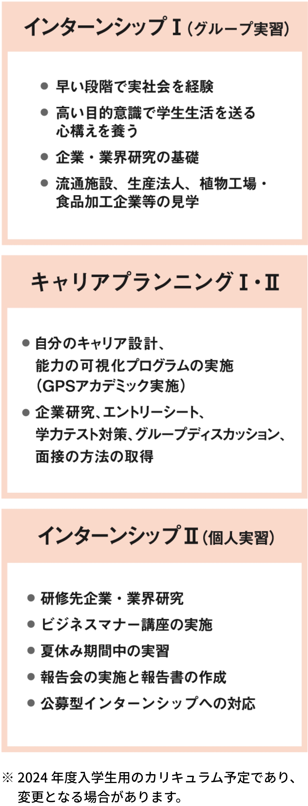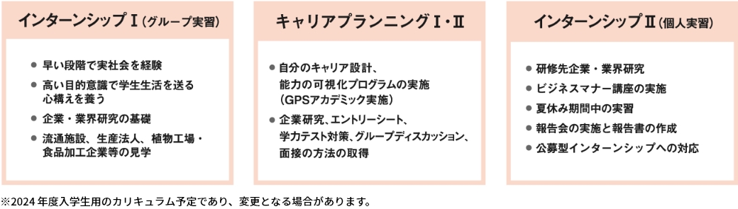 ①1年次には、学びの基礎となる教養科目と実習や演習を通して、生産から加工・販売までの一連の流れ(フードチェーン)を理解します。2年次以降はコースに分かれて、食料産業学を体系的・実践的に学びながら専門知識と技術を修得します。