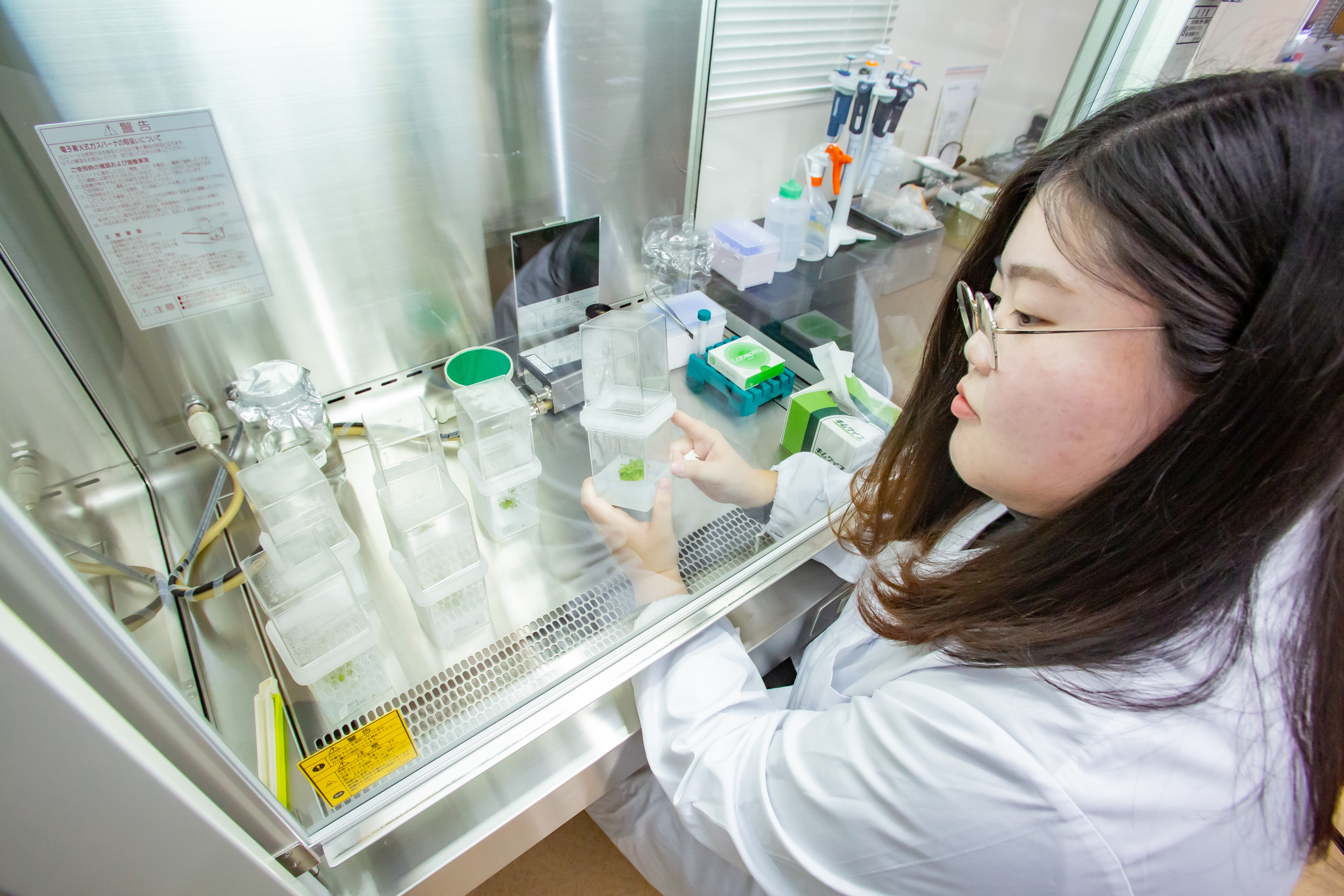 卒業研究ではアグリコースの吉岡俊人先生が研究をしている「種子春化候補遺伝子PSV1」の機能を解析することにしました。春化は植物が低温を感じることで花成が誘導される現象であり、緑体春化と種子春化に分けられます。緑体春化を誘導する遺伝子は解明が進んでいますが、種子春化は未だに未解明です。研究の最終目標は種子春化の責任遺伝子としてPSV1が確定されることであり、将来的には植物にPSV1を導入して種子段階で花成管理することができようになれば、様々な農業分野で応用できると思っています。 朱 多銀(チュ ダウン)さん(韓国出身)
