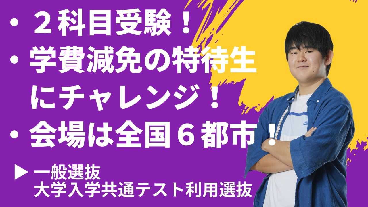 得意科目を活かせる2科目受験、特待生の選抜、入学手続期間の長期設定で国公立大学の合格発表後に入学手続が可能!など本学が第一志望の方はもちろん他大学の併願受験を検討中の方にもおすすめの選抜試験区分です。