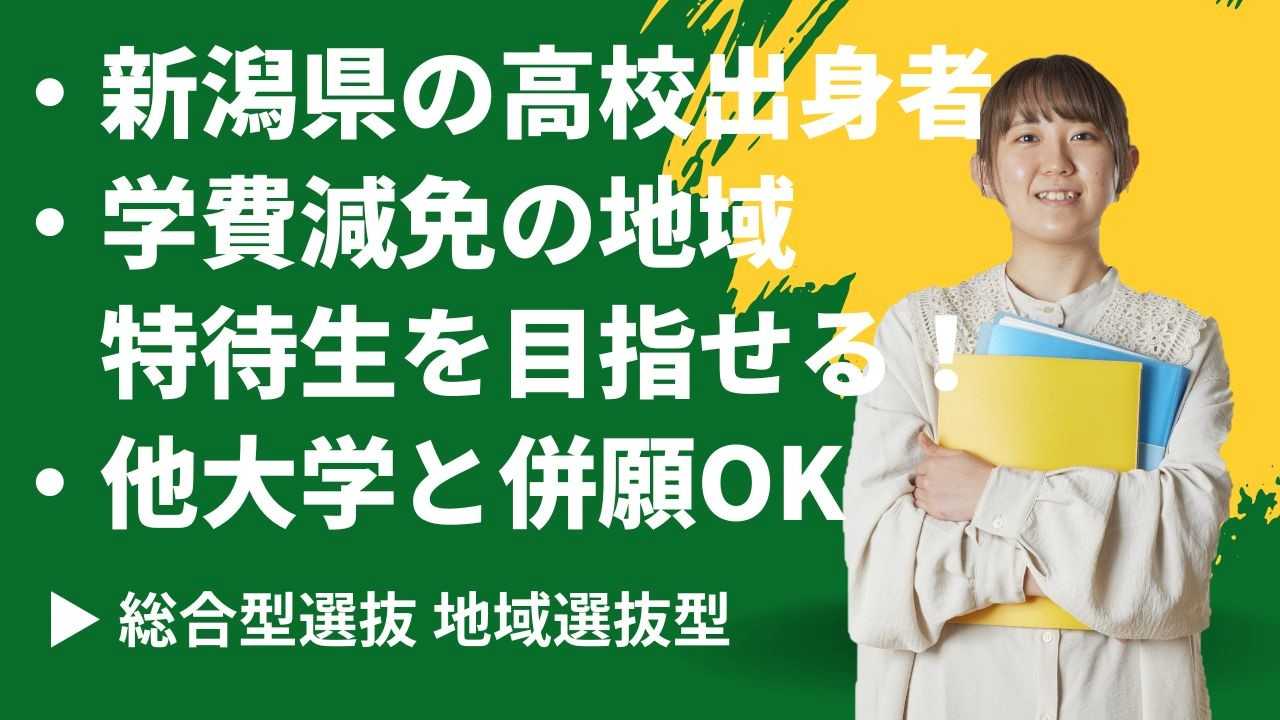 他大学との併願受験が可能な「主体性重視型」、新潟県の高校出身者限定で学費減免の地域特待生を選抜する「地域選抜型」、これまでに取り組んだスポーツの実績を評価する「スポーツ型」と3つの総合型選抜を設定しています。いずれも面接試験を重視し、ご自宅等からオンラインでの受験が可能です。