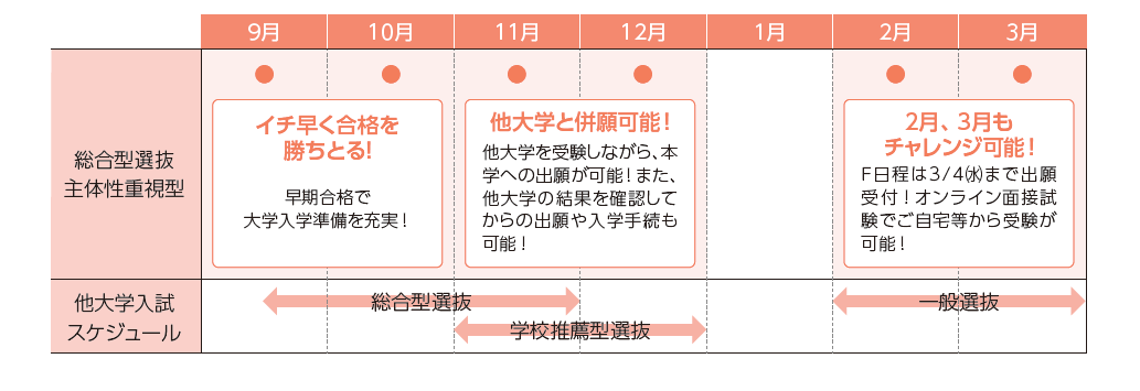 本学が第1志願の方はもちろん、他大学との併願を検討している方も受験が可能です。