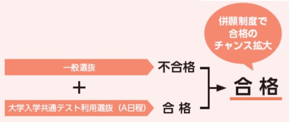 「併願制度」を利用することで、一般選抜で合格とならなかった場合でも大学入学共通テスト利用選抜で合格となる場合がありますので、合格のチャンスがさらに広がります。