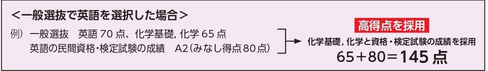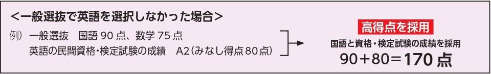 ※一般選抜において英語の民間資格・検定試験の成績を提出し、且つ試験当日に英語を選択した場合は、民間資格・検定試験の成績(みなし得点)と当日受験したの英語の得点のうち高い方を合否判定に活用します。(下記、例1・2をご参照ください。)