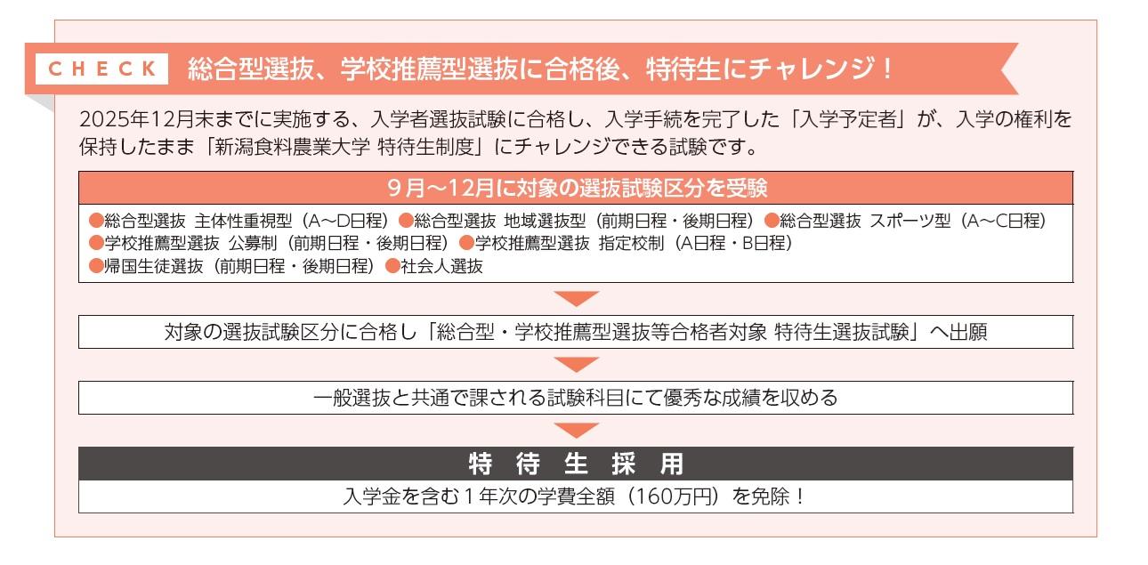 - 2025年12月末までに実施する、総合型選抜、学校推薦型選抜等に合格し入学手続を完了した「入学予定者」が、入学の権利を保持したまま特待生制度にチャレンジできます。