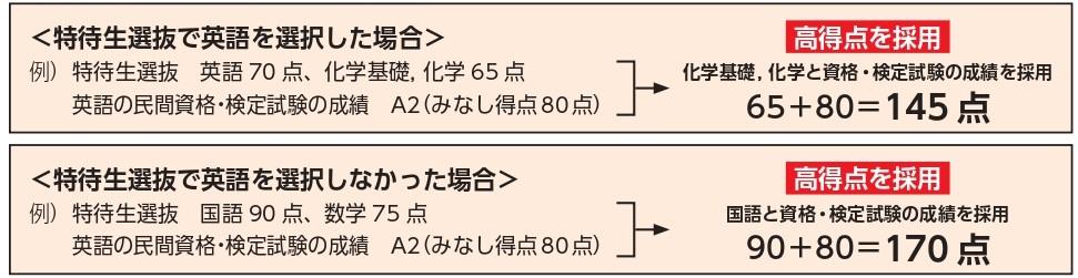 ※特待生選抜試験において英語の民間資格・検定試験の成績を提出し、且つ試験当日に英語を選択した場合は、民間資格・検定試験の成績(みなし得点)と当日受験したの英語の得点のうち高い方を合否判定に活用します。(下記、例をご参照ください。)