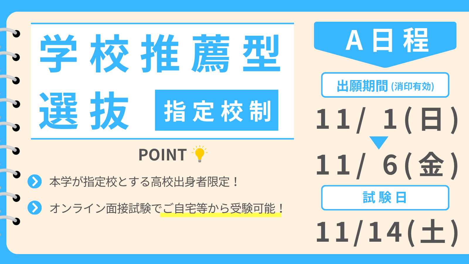 - 本学が指定校とする高等学校等を2026年3月卒業の者または2027年3月卒業見込みの者。