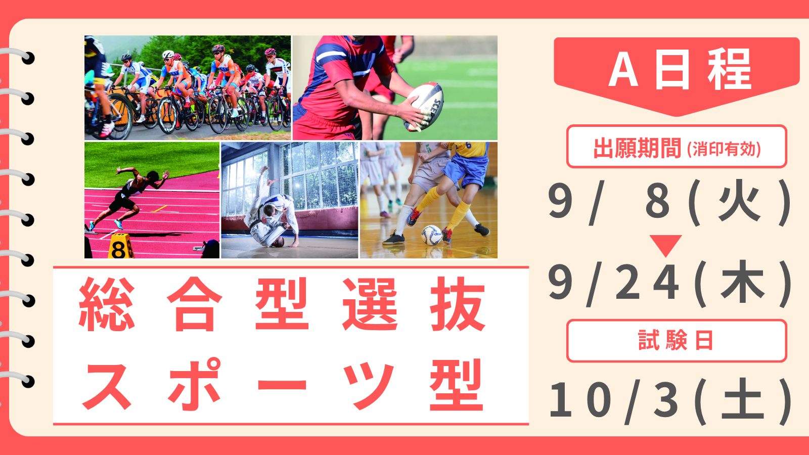 総合型選抜 スポーツ型(全日程)において、出願資格の4(競技・種目を問わずスポーツの経験があり、本学入学後、「自転車競技部」「柔道部」「男子ラグビー部」「陸上競技部」「フットサル部」のいずれかに所属し、その競技に取り組む意志のある者。)により出願し、合格した者で、心身ともに健康で4年間継続的に活動できる能力ならびに強い意志のある者。