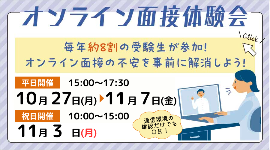 通信環境や接続方法の確認はもちろん、希望者には本番を想定した模擬面接も可能!
