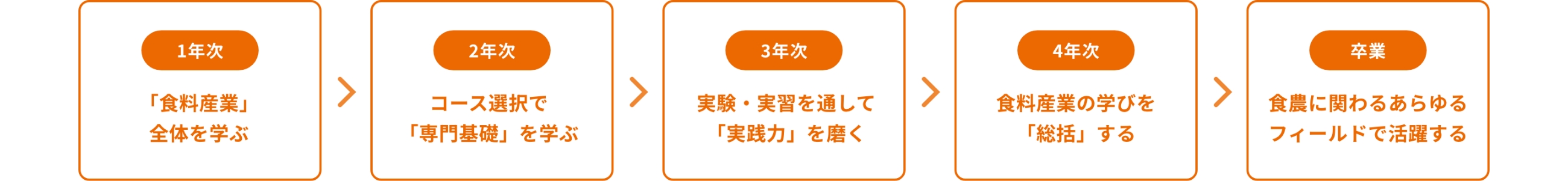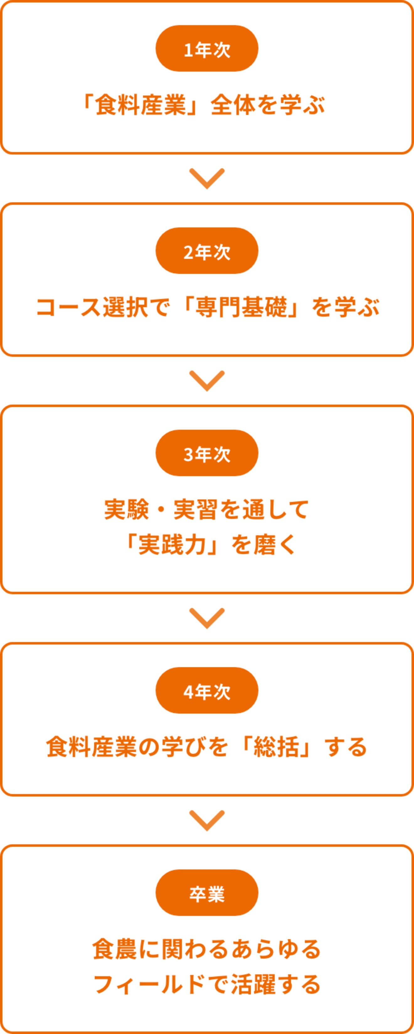 1年次では食料産業(農業~経済~食卓)の全体を学び、2年次以降は各コースに分かれ、実習・実験を通して専門的に学びます。卒業後は、食農に関わるあらゆる企業で活躍できる人材育成を目指します。