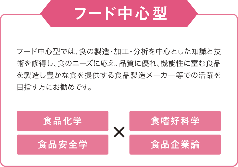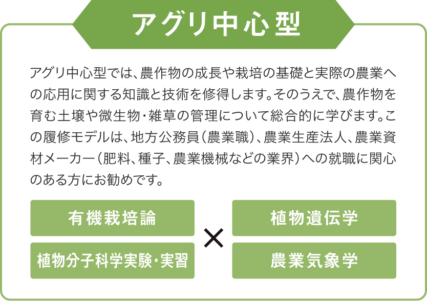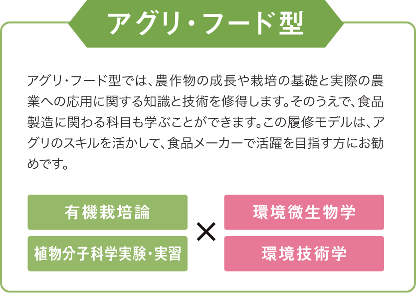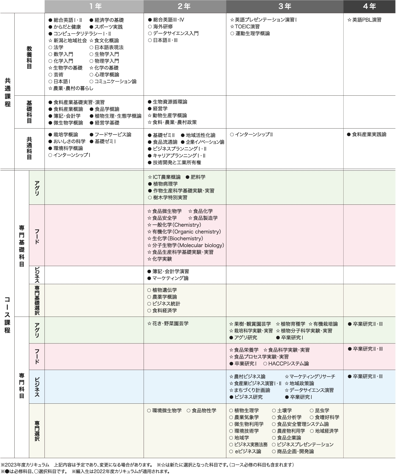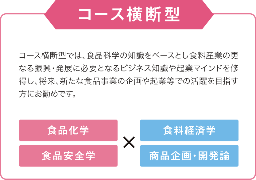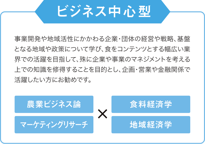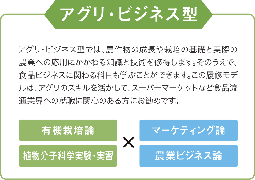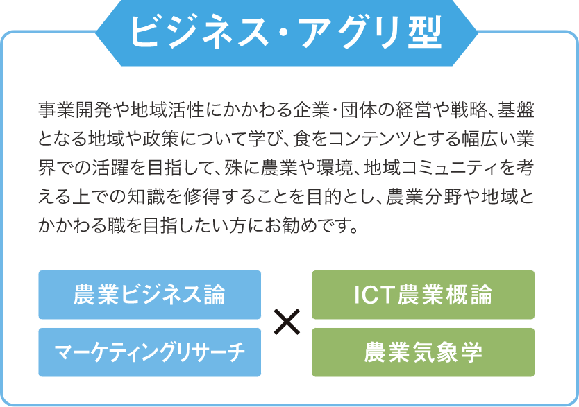 本学では、1年次から4年次まで「共通課程」でフードチェーン全体を学び、2年次より学生の主体的な選択によって〈アグリコース〉〈フードコース〉〈ビジネスコース〉の3つのコースに分かれ「コース課程」で専門知識・技術を修得します。 さらに4年間を通して、分野(コース)の枠を超えた授業を実現することを通じ真の“食のジェネラリスト”として地域の経済、社会の発展に貢献する人材を養成します。 カリキュラム 学びのカスタマイズ 自分の将来や目標に合わせて、コースを横断した科目履修が可能です。