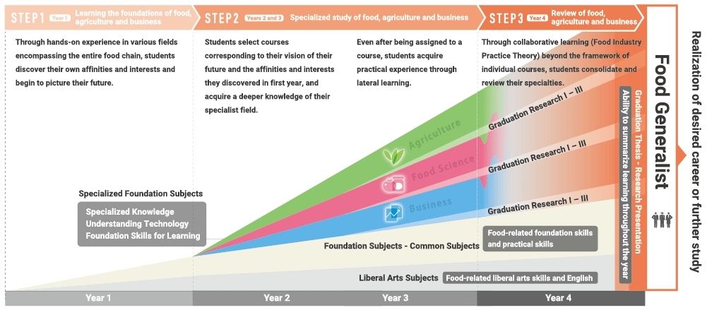 Throughout the four years, students acquire a broad liberal arts culture as members of society, and the ability both to play an active role in the international community and to contribute to social development by creating new values through a comprehensive understanding of food, agriculture and business.