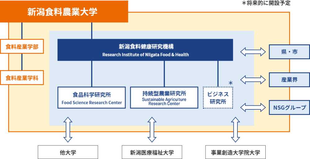 食および食産業に関わる「新潟の知の集積」や「新潟フードバレー拠点形成」を目指して、新潟食料健康研究機構は2020年4月に設立されました。機構内に設置された食品科学研究所と持続型農業研究所が、新潟および全国の食品産業、環境産業、農業、大学、研究機関、行政機関と連携して、食・食料生産・健康などの基礎研究および応用研究を行っています。