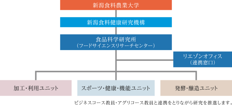 食品科学研究所は、3つの研究部門(加工・利用ユニット、スポーツ・健康・機能ユニット、発酵・醸造ユニット)とリエゾンオフィスで構成され、プロジェクトに応じてアグリコース・ビジネスコース教員も交えて円滑に課題解決を遂行します。