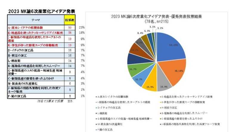 - ・3位-2作-9%の19票:Iチーム-新潟県の特産品を使用したヨーグルトの提案、Kチーム-学生が作った野菜スープの移動販売