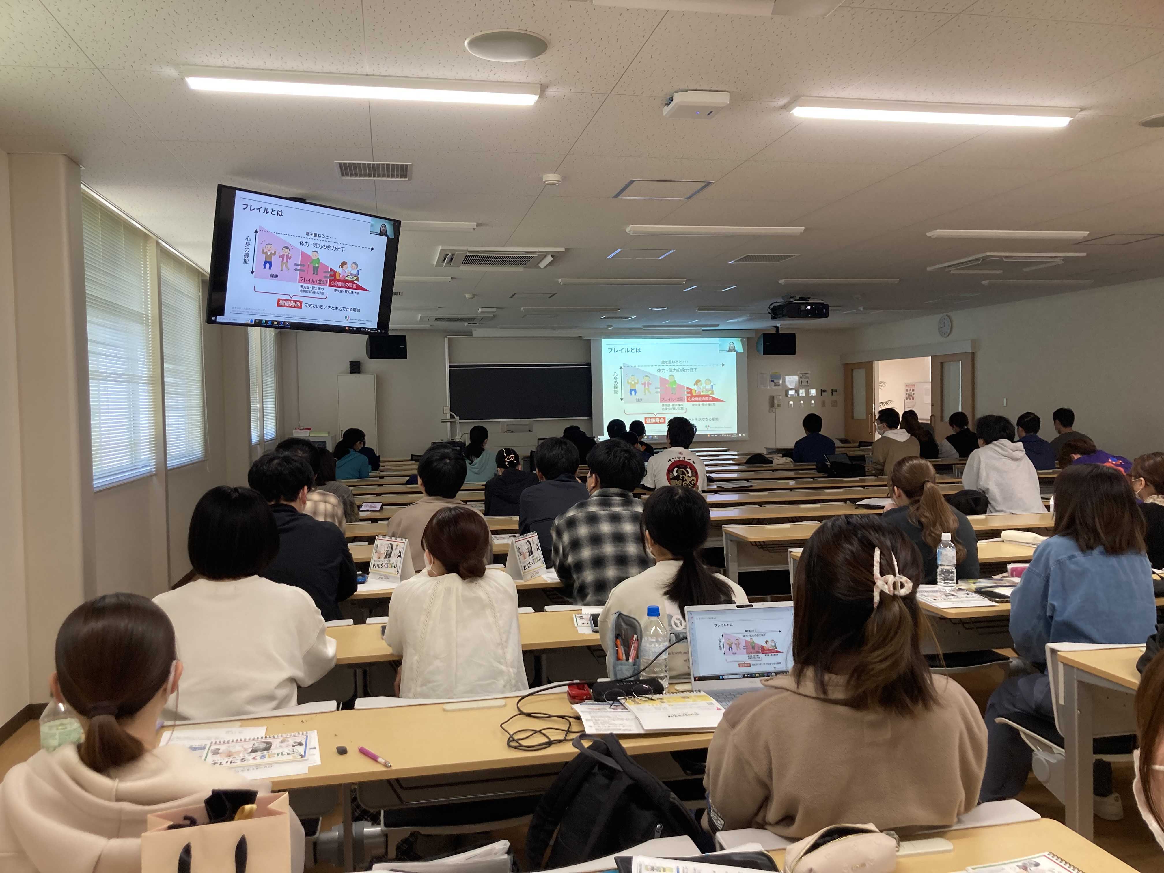 最後には、学生の皆さんにまとめとして「食べることは人間の根源的な機能である」「フレイルという考え方に3つの要素と3つの予防策がある」「参加すること、楽しむことに健康的に人生を生きるための重要な要素が詰まっている」「オーラルフレイル予防として『まいにち、くちびる』がある」「キャリアは途中でいろいろ変わったって良い!」とエールを送っていただきました。