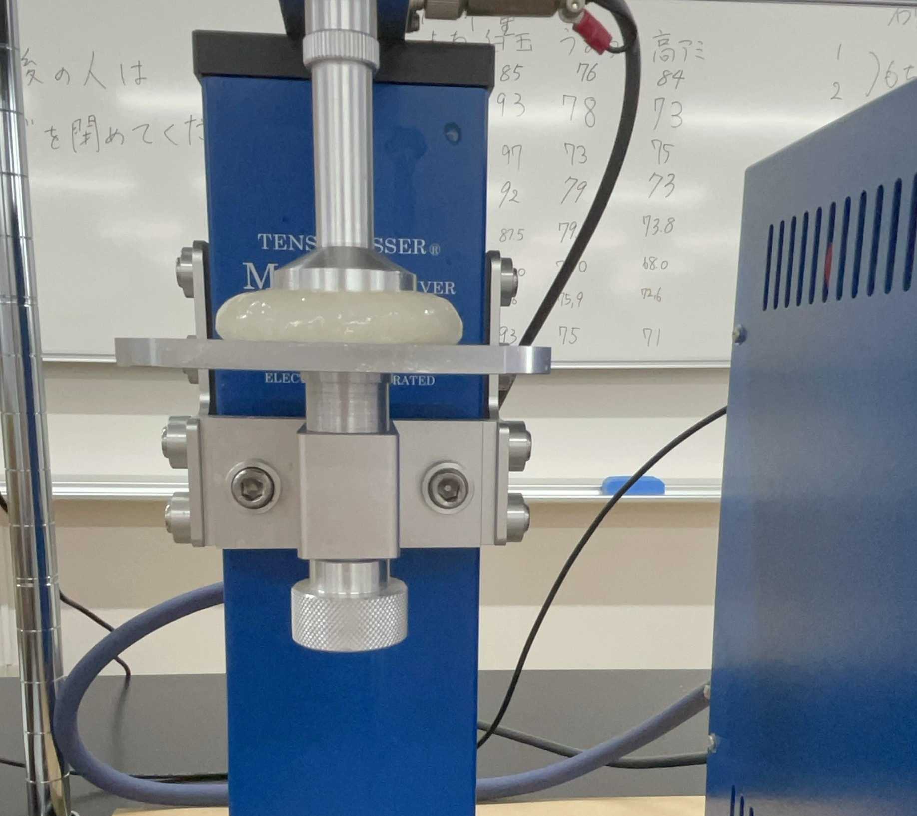 完成した白玉団子をテンシプレッサーという機械を用い、硬さの測定を行いました。