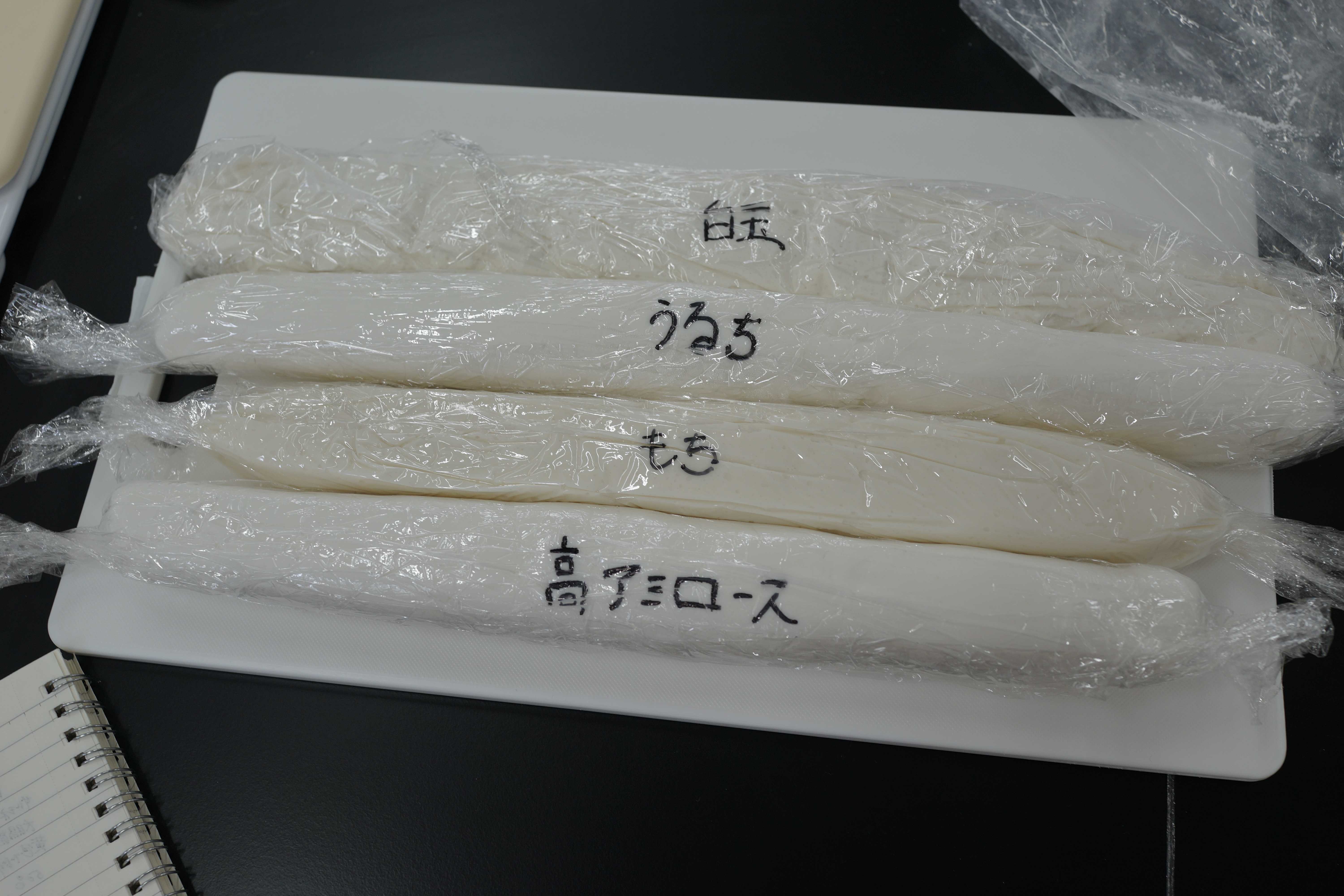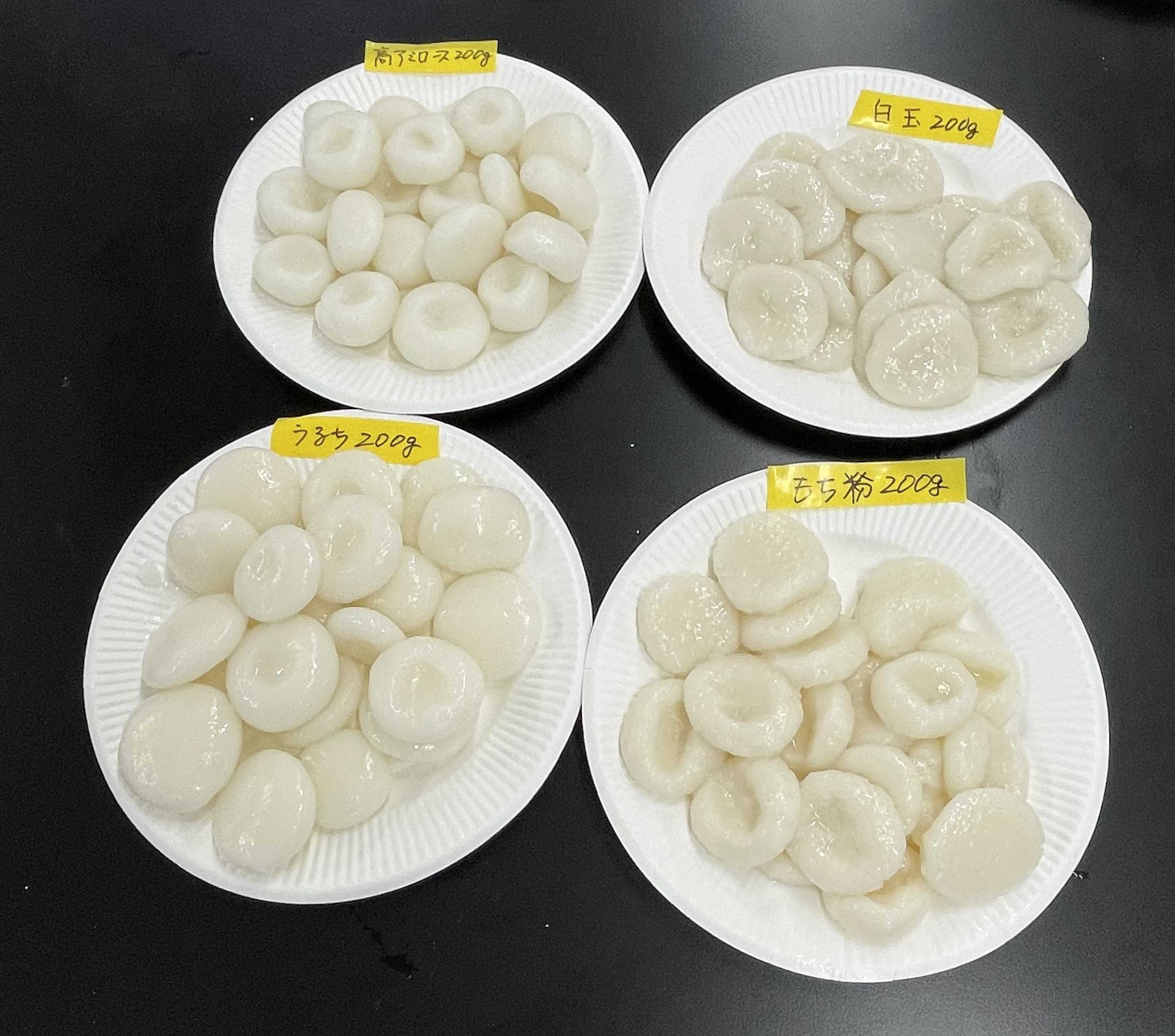 米の種類と団子の硬さの関係を調べるため、以下の4種類の米粉を使用して、白玉団子を製造しました!