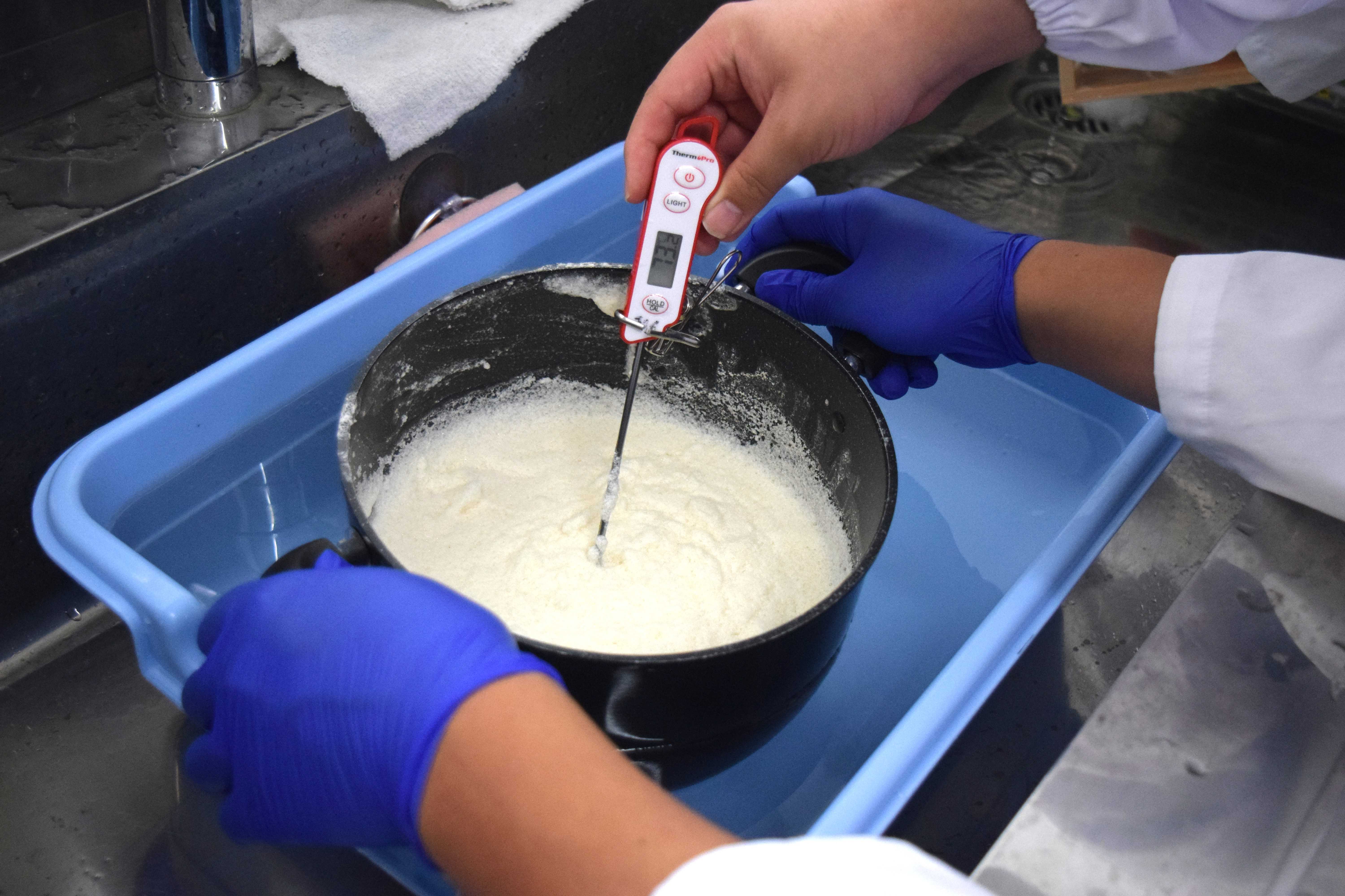 豆乳を85℃まで加熱し、にがりを入れて軽く混ぜます。この際の温度がとても重要で、低すぎるとうまく固まらず、高すぎると硬くなってしまいます。