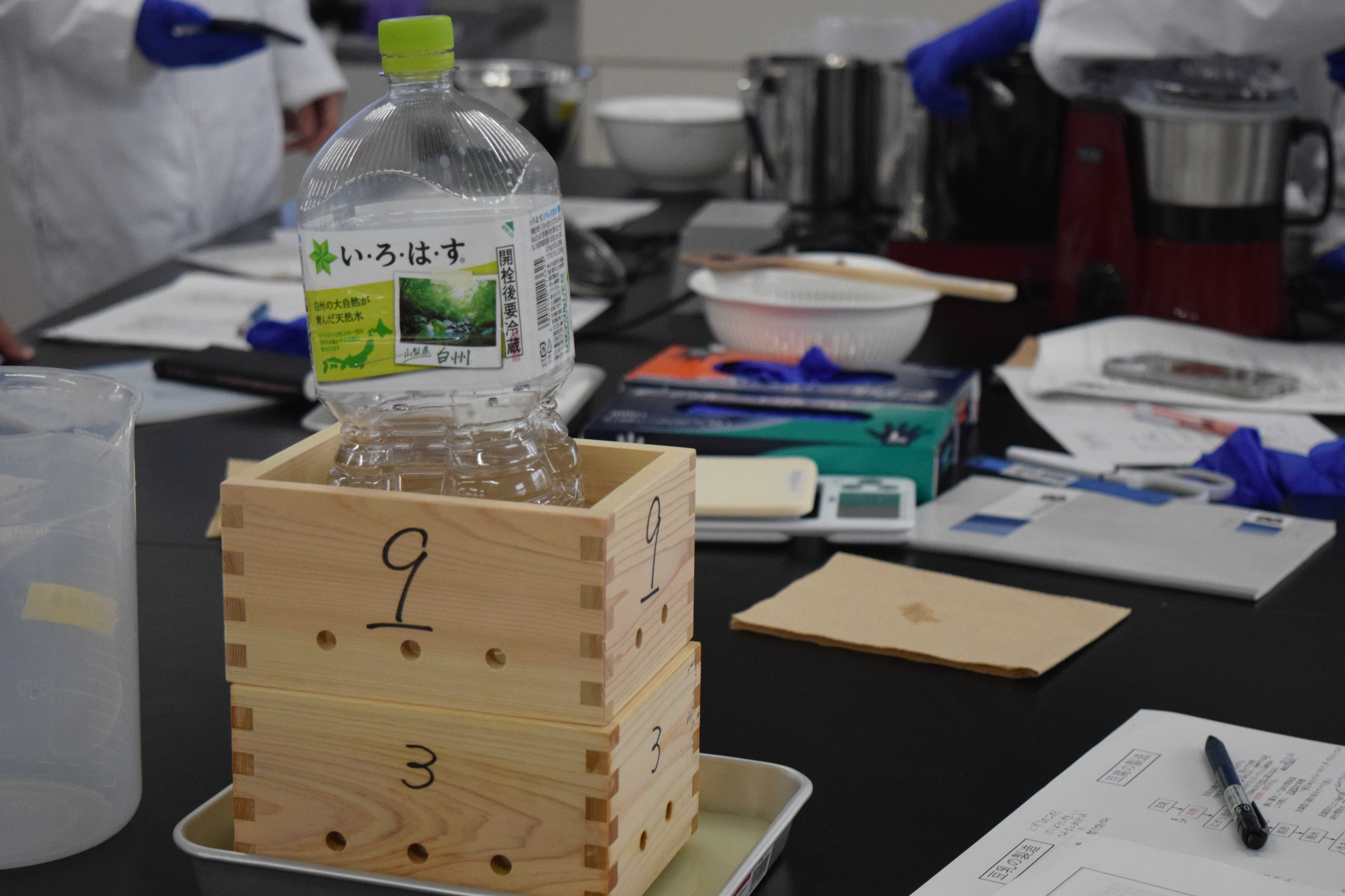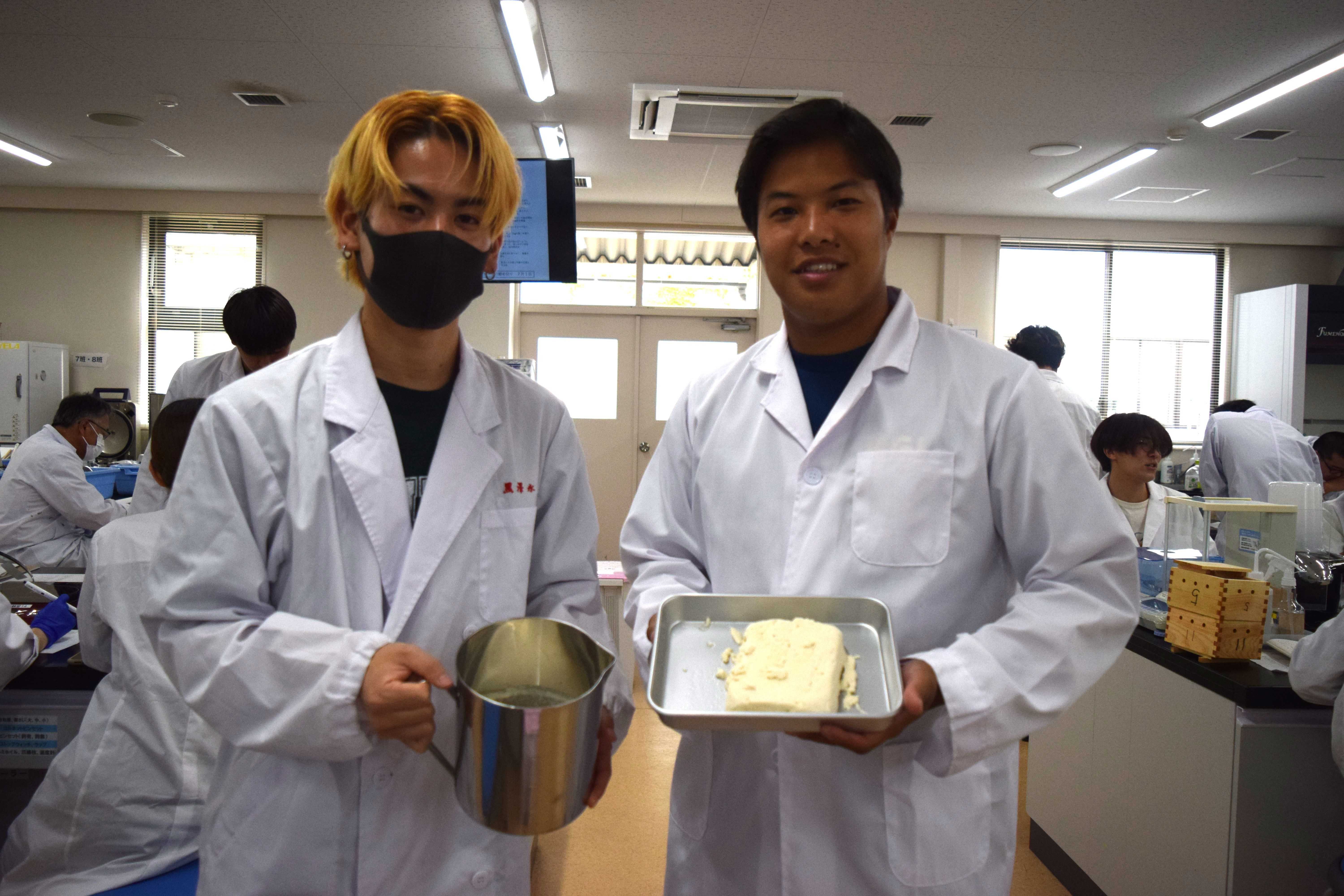 また、学生には今回製造した豆腐の原価を計算し、市販の豆腐が低価格の理由を考察するという課題が課されました。