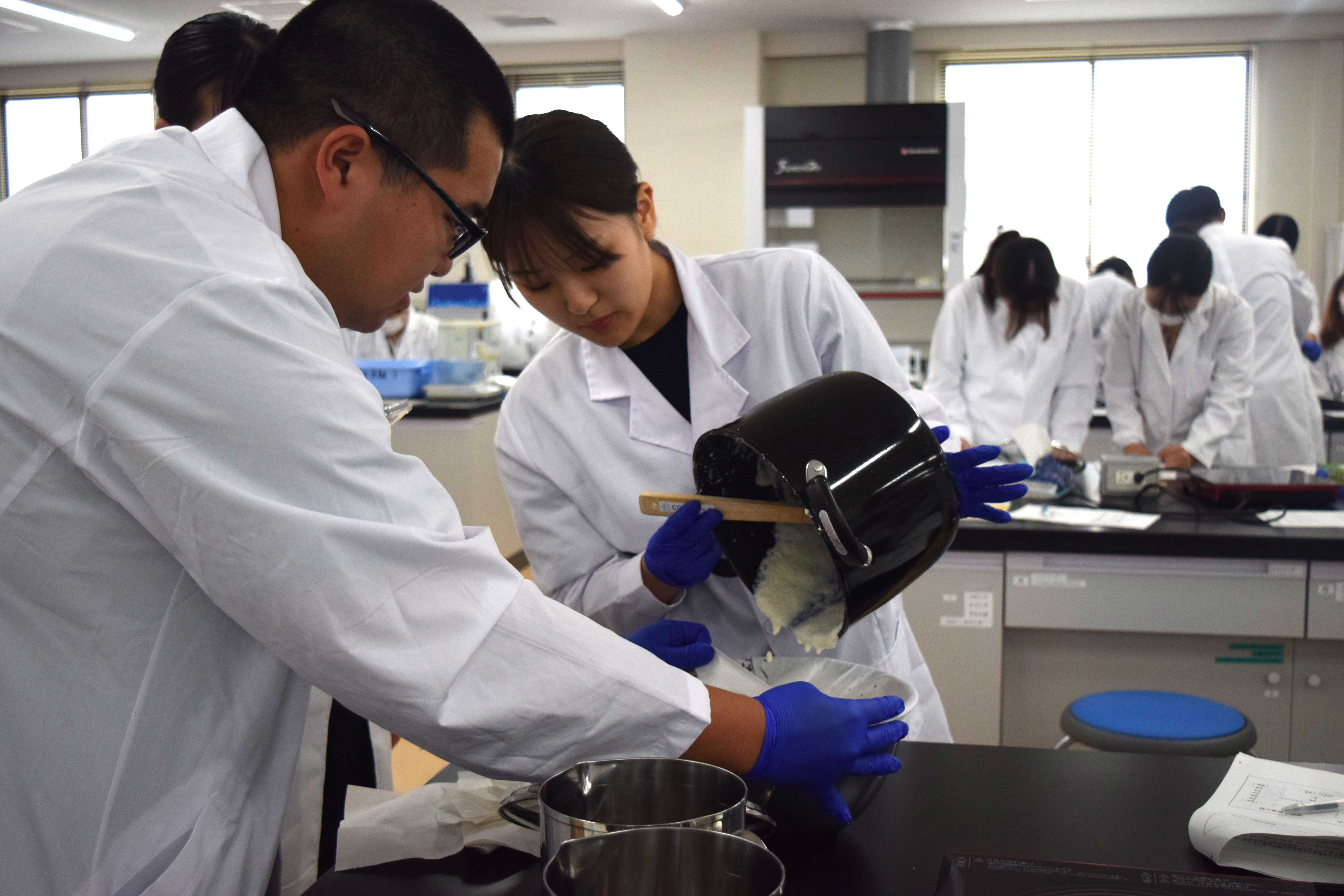 2年生フードコース必修科目「食品生産科学基礎実験・実習」では、各種の食品を実際に調理・加工・保存し、食品原料の特性、製造原理、製造方法、およびその取り扱いについて理解し、高校で学んだ化学、生物学、物理学などの基礎知識と食品製造の工程との関連を理解することを目的としています。