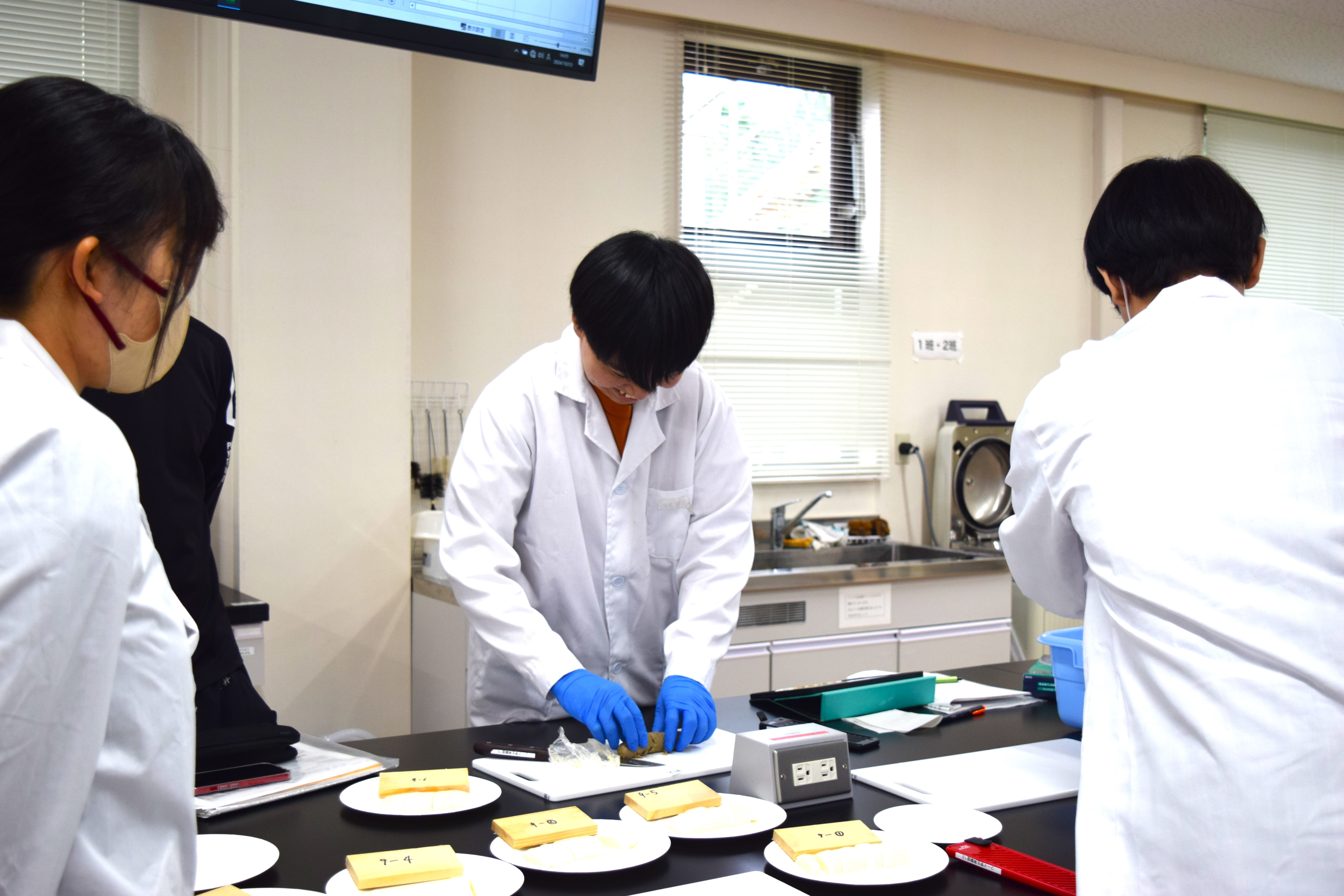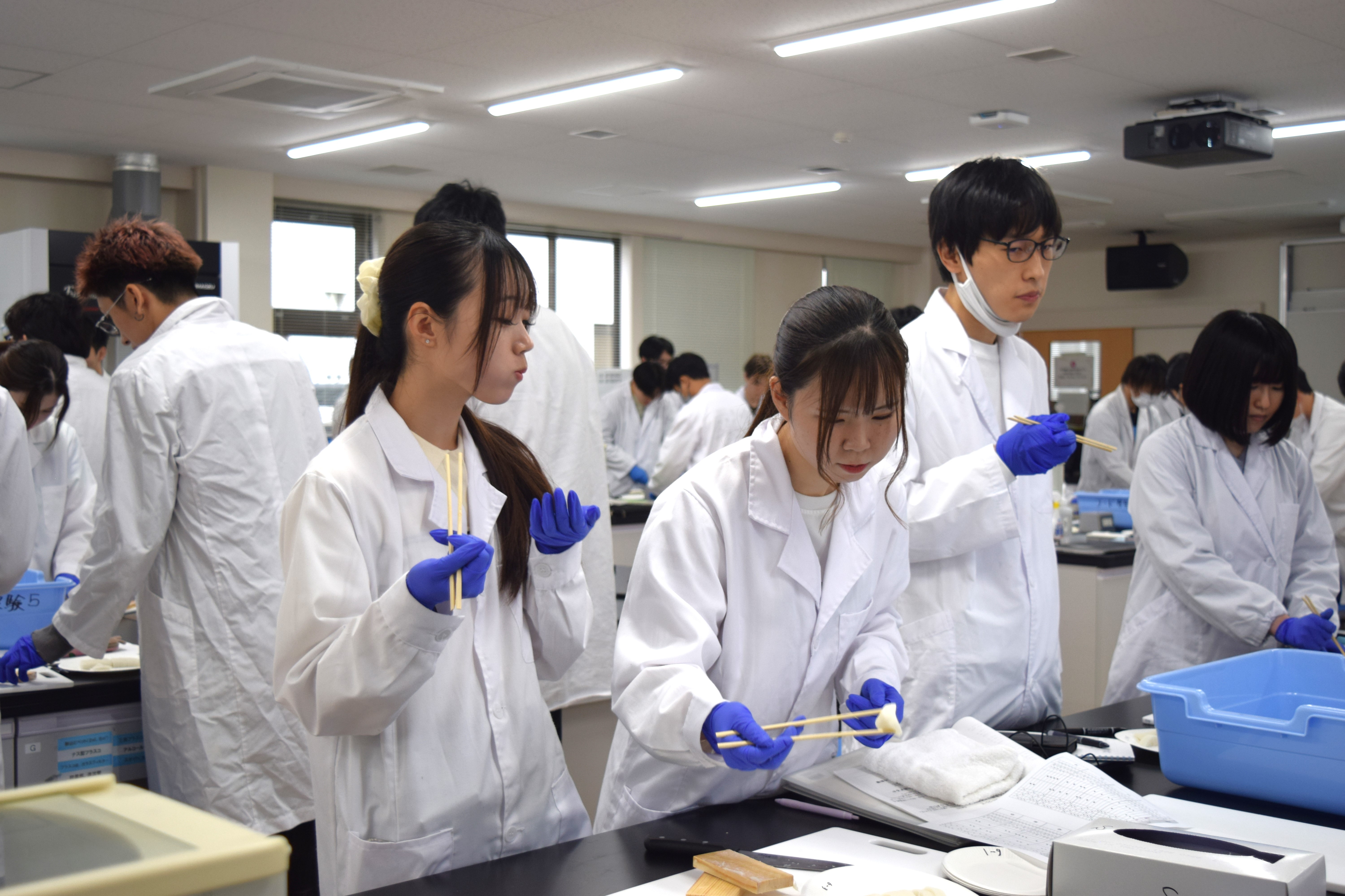 3年次フードコース必修科目「食品プロセス学実験・実習」では、代表的な加工食品・発酵食品を実際に製造し、種々の加工食品の製造工程・製造技術の特徴について理解するとともに、食品の官能評価方法、機能性成分の測定方法、衛生検査の方法等について理解を深めていきます。