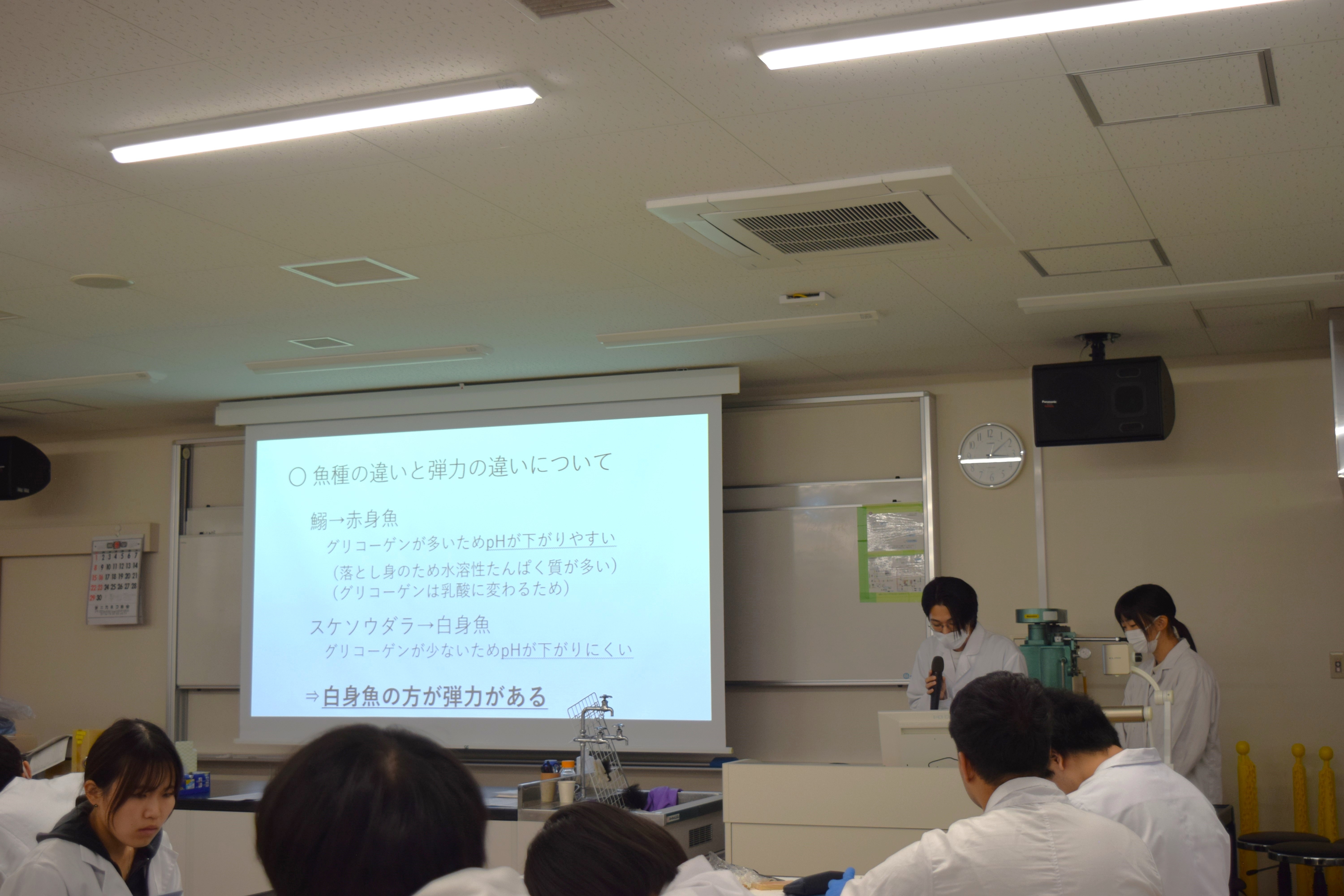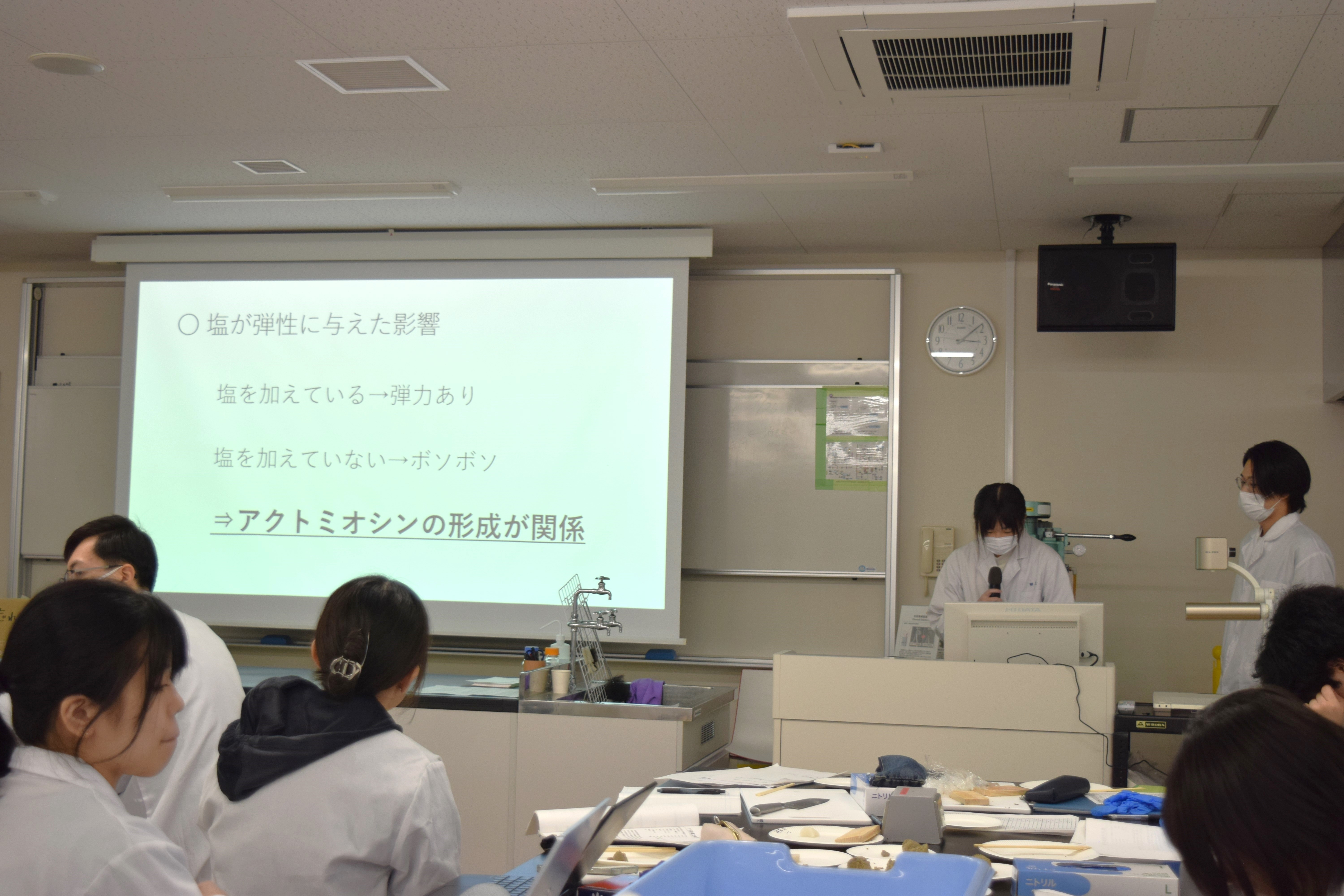 発表の中ではかまぼこ製造における塩の重要性、白身魚が適している理由等をそれぞれの成分、特徴を踏まえて発表していました。
