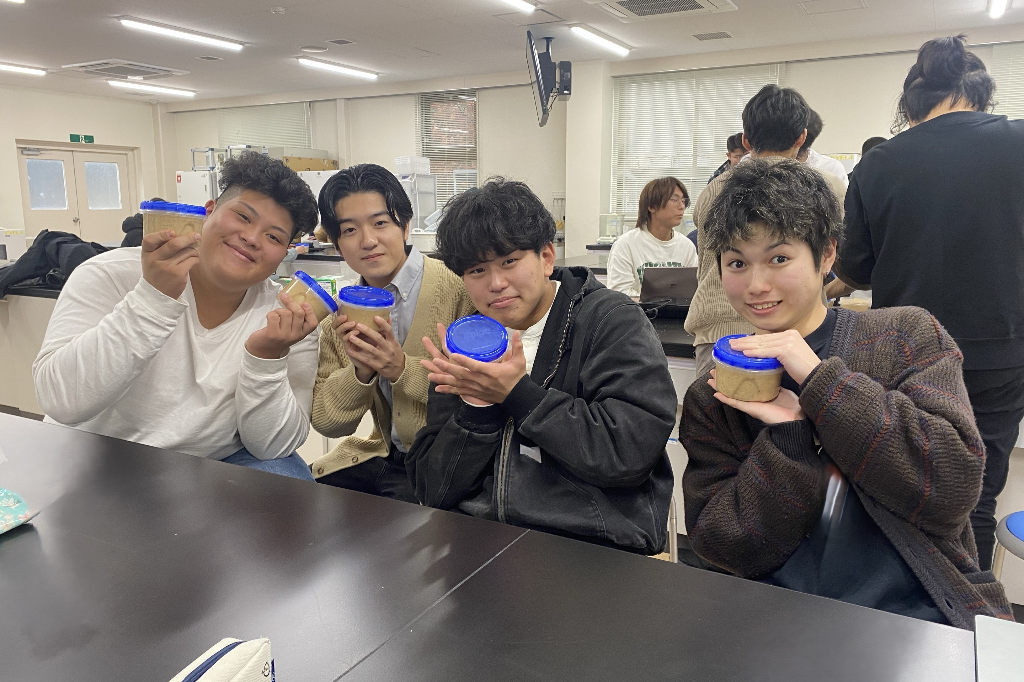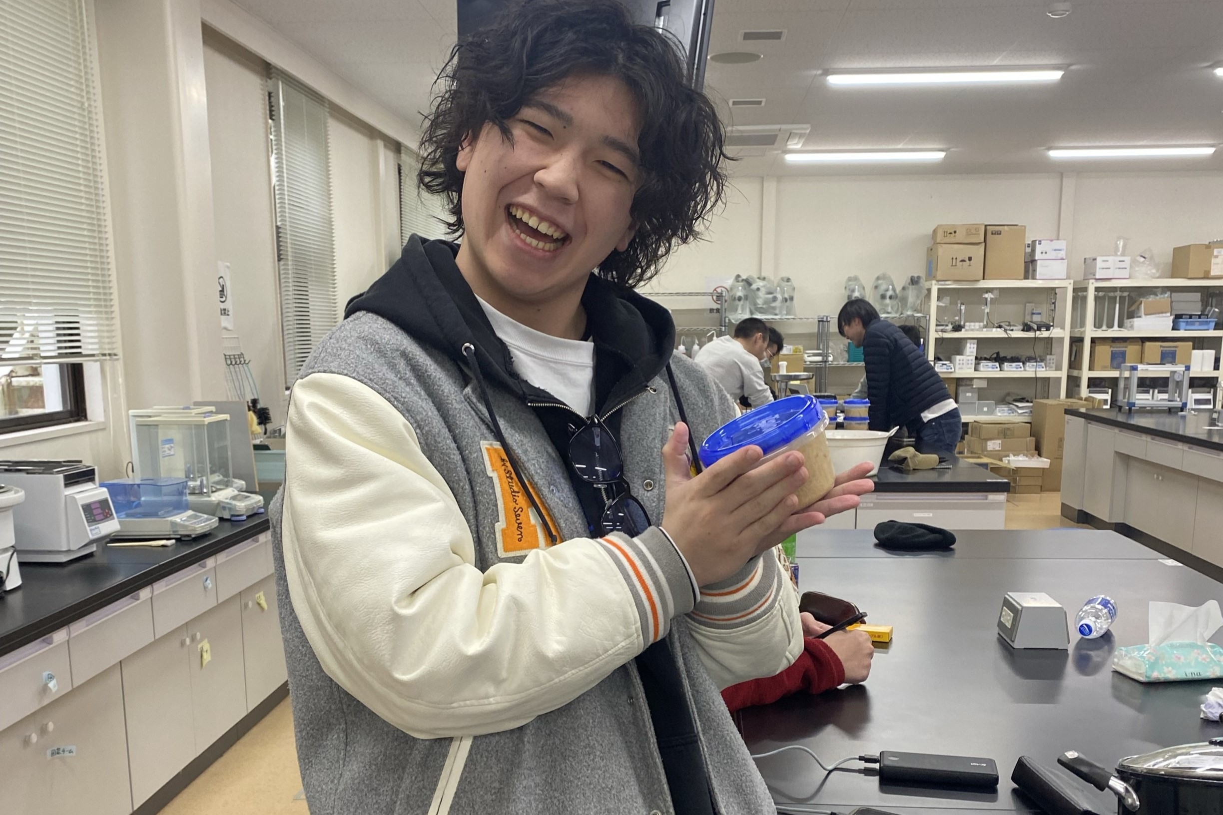 材料は本学や本学のある胎内市や周辺地域に関係しているものを使用。大豆はJA北越後胎内市店のご協力で入手した胎内市産エンレイ、米麹は『食料産業基礎実習』の授業で、中条農産さんのご指導のもと、田植えを経験したお米を胎内市にある五十嵐麹屋さんに加工してもらったものを使用。また、塩は笹川流れの日本海水からとれた塩を使用しました。そして種味噌で使用したものは現2年生が昨年、同授業で仕込んだ味噌を使用!
