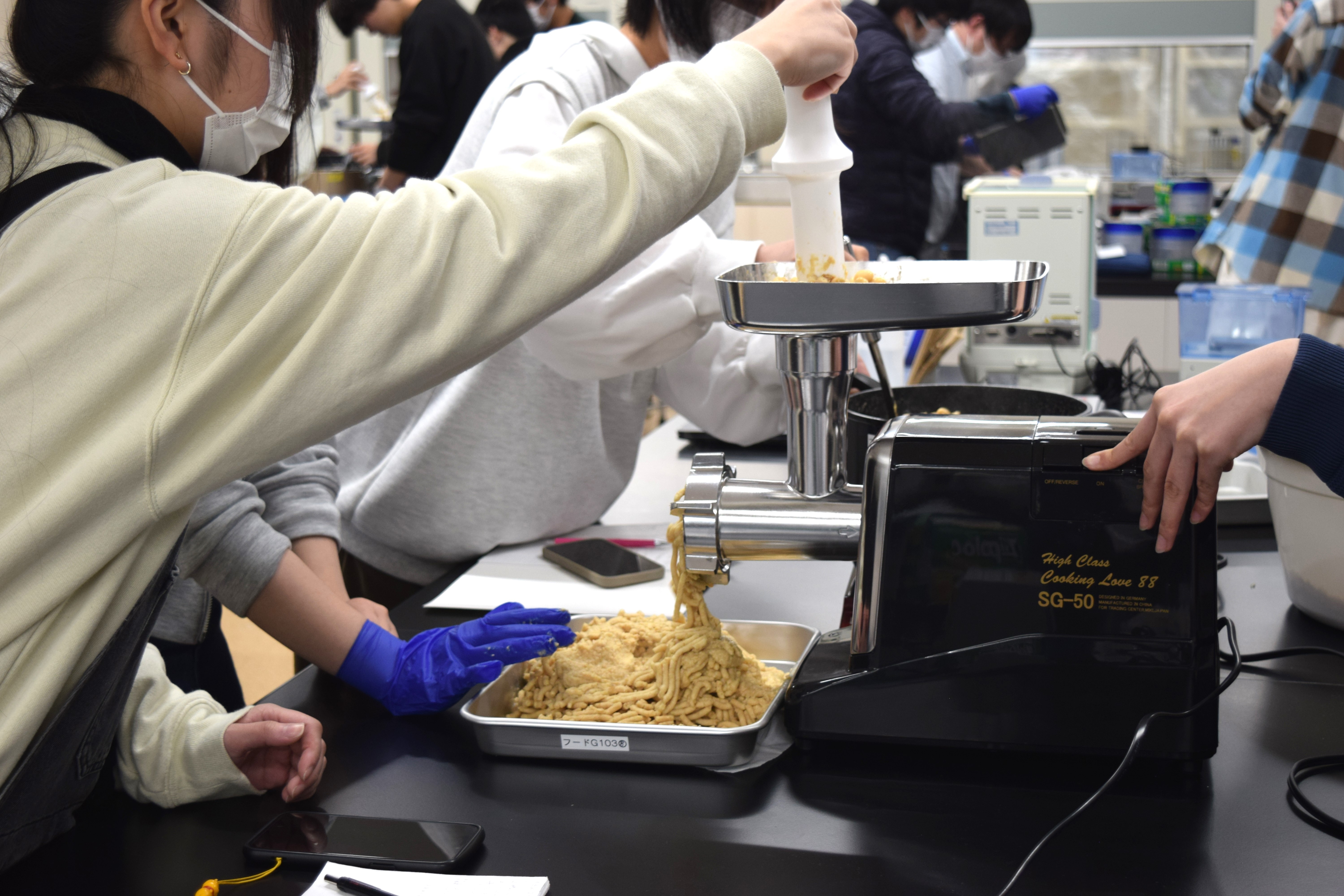 1年次後期必修科目『食料産業基礎演習』では、前期開講の『食料産業基礎実習』で学んだ知識を活かし、演習を通して、社会や消費者のニーズに対応した製造の企画や開発に関する基礎的な知識やスキルを修得します。