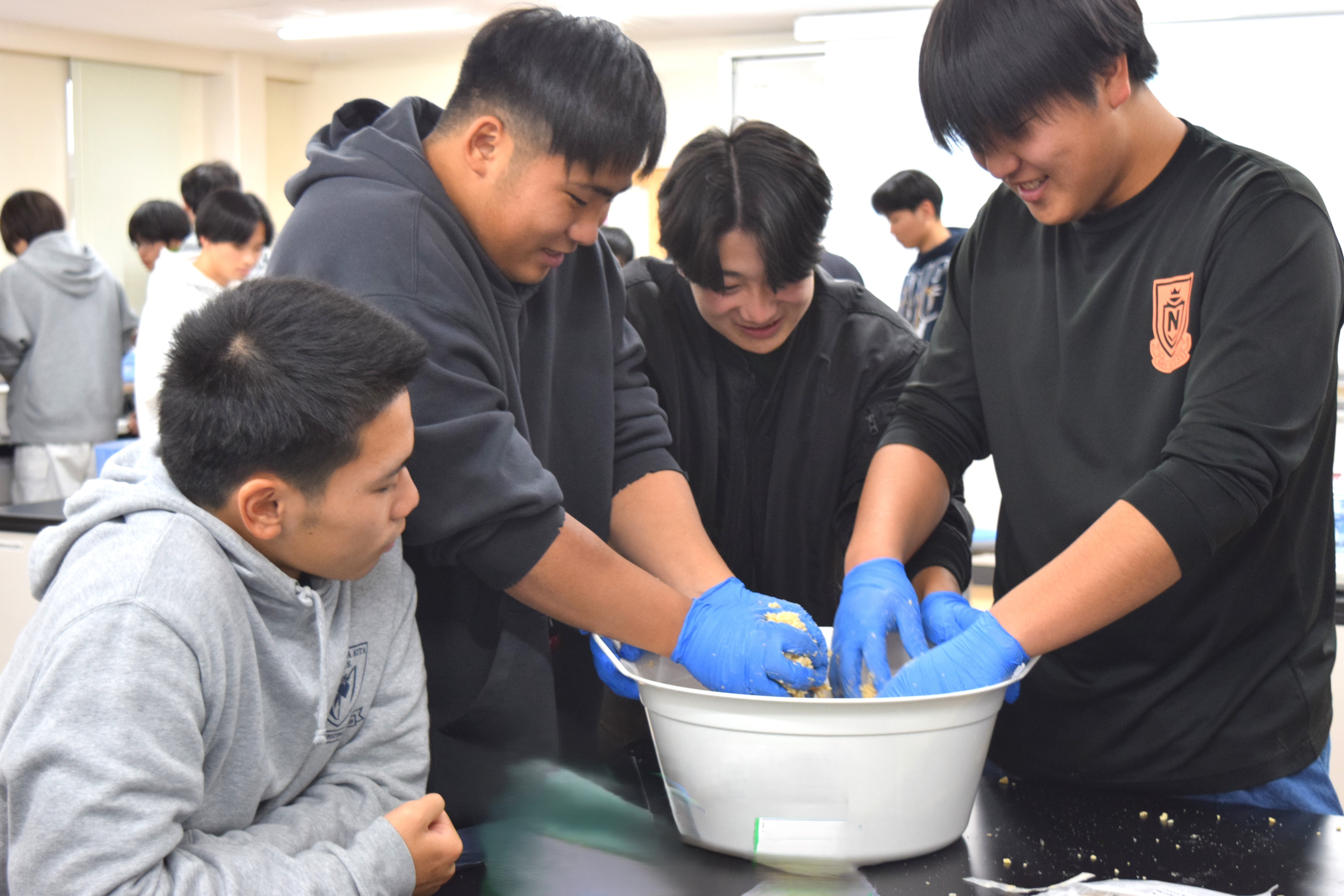 これまでに味噌仕込みを実際に経験した学生は2~3割程度。初めて経験する学生が多く、グループで協力しながら味噌仕込みを行いました。