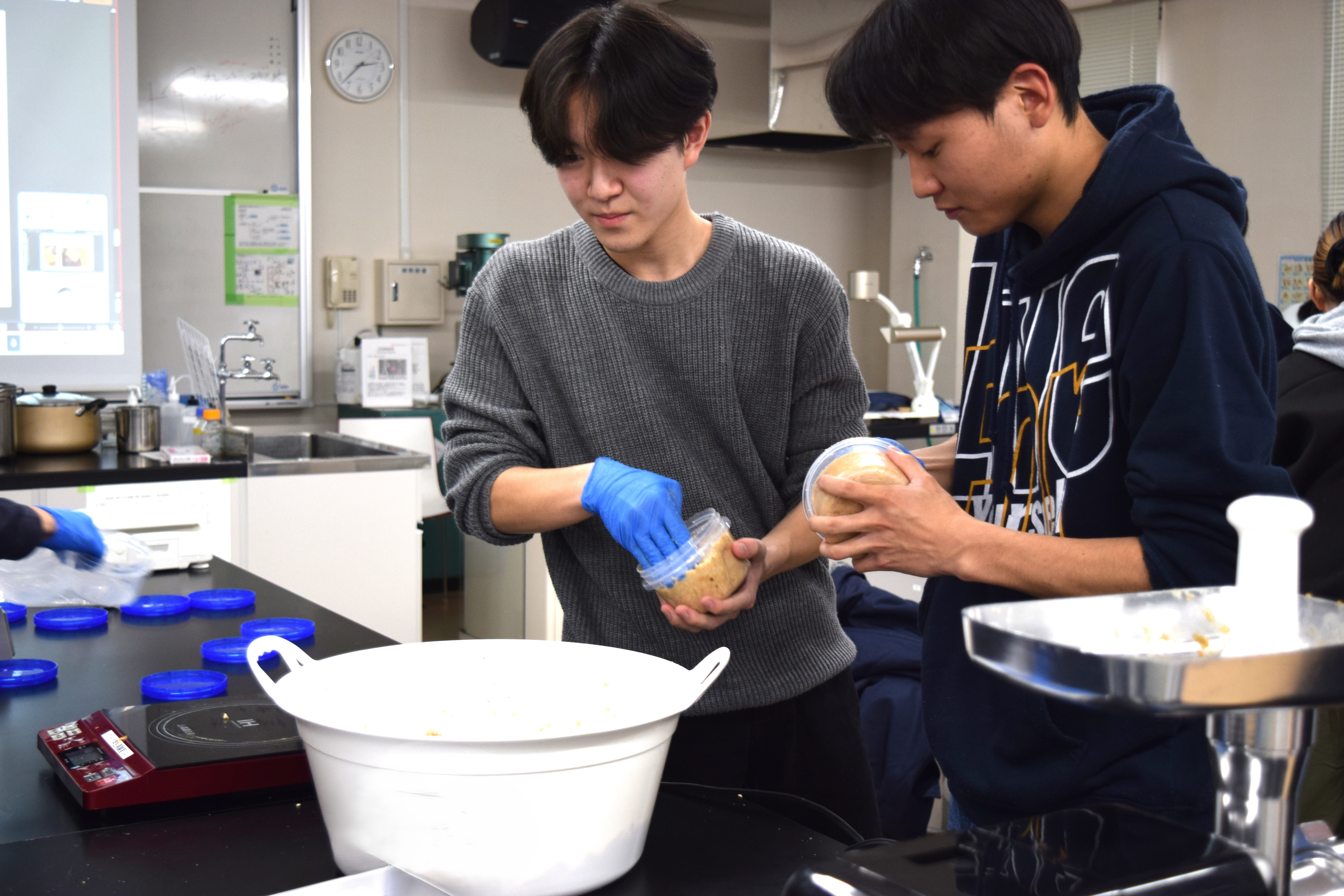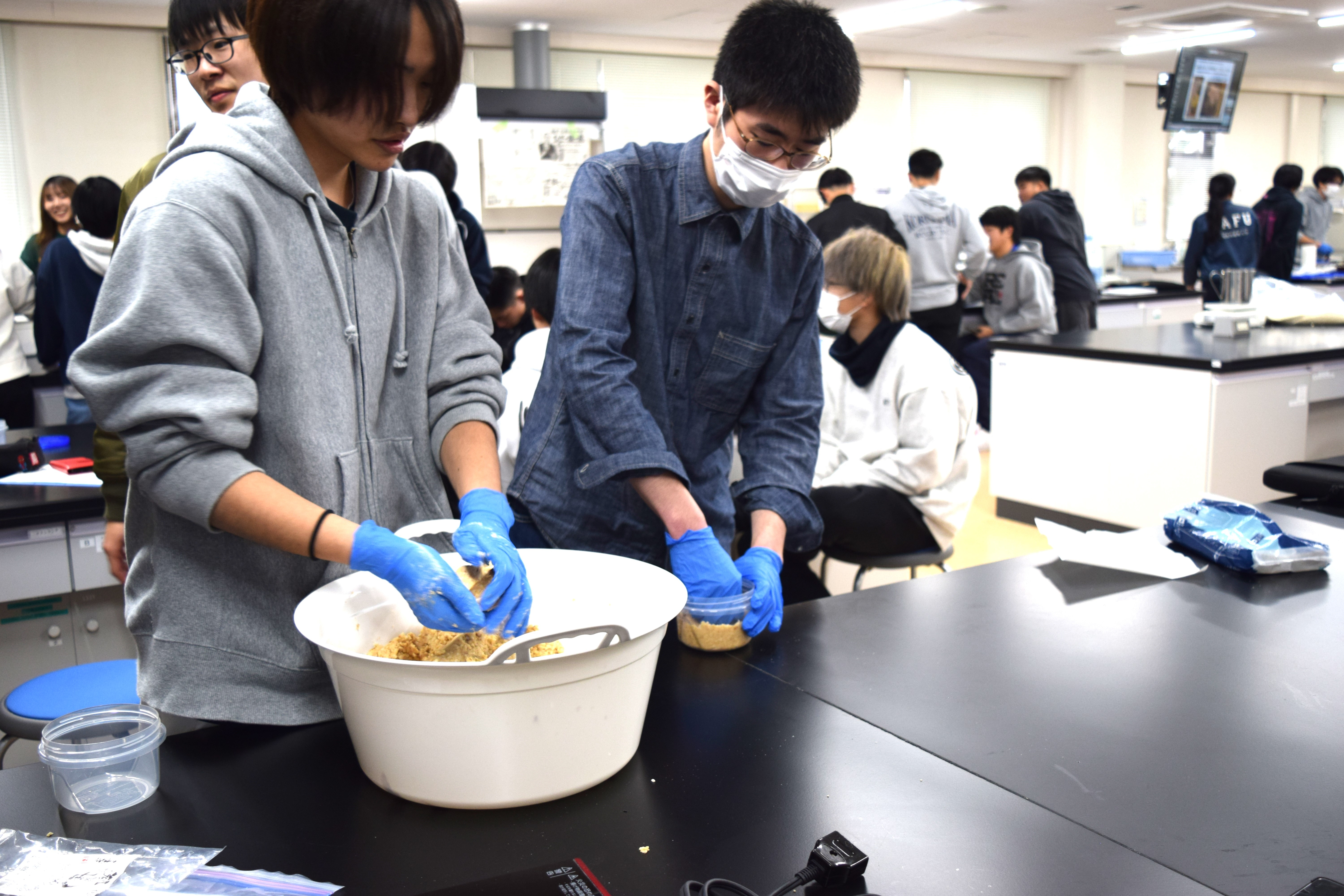 ポイントはカビを防ぐため、“空気が入らないように詰める”こと。実家や本学のオープンキャンパスで味噌仕込みを体験したことがある学生が周りの学生にアドバイスする姿も見受けられました。