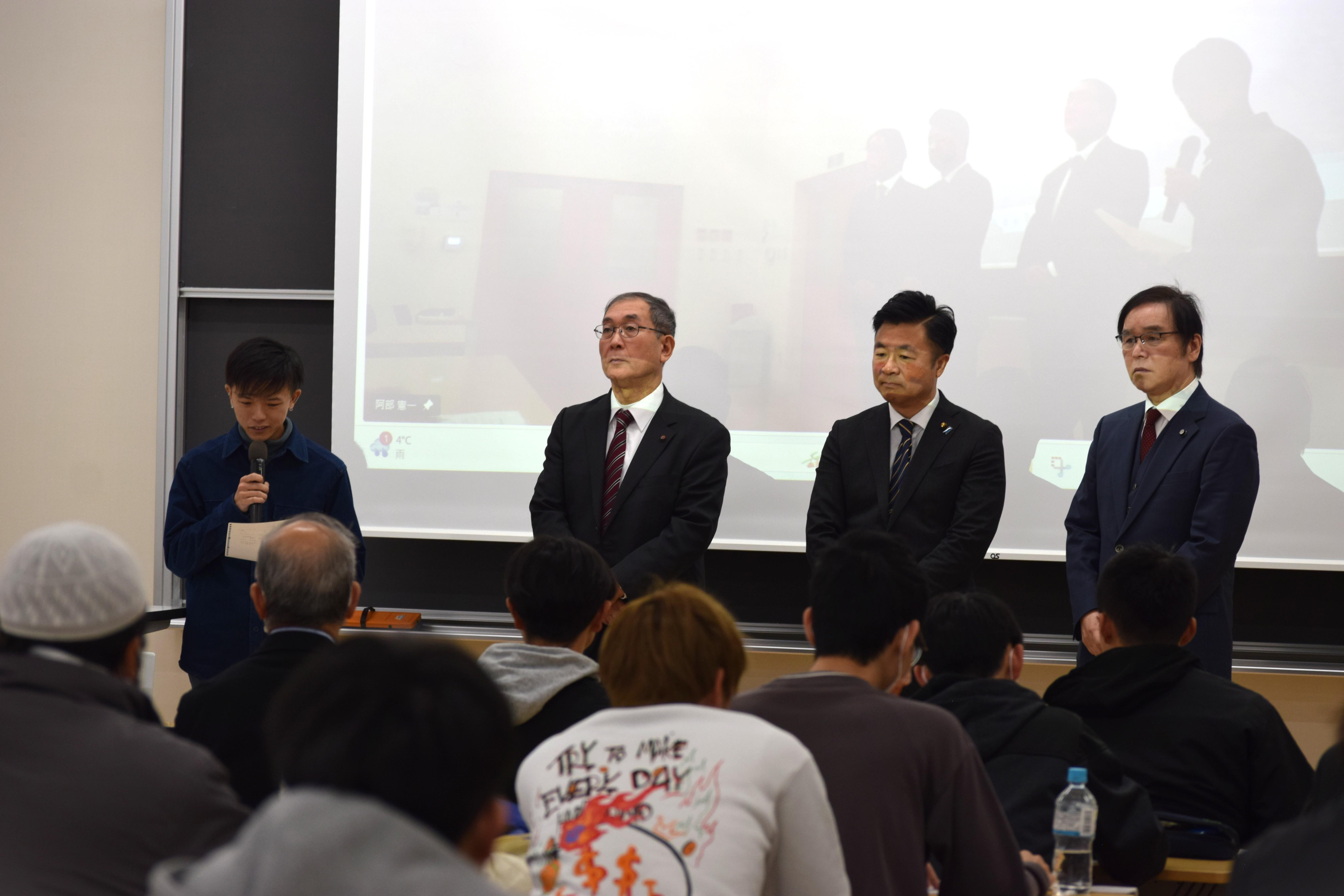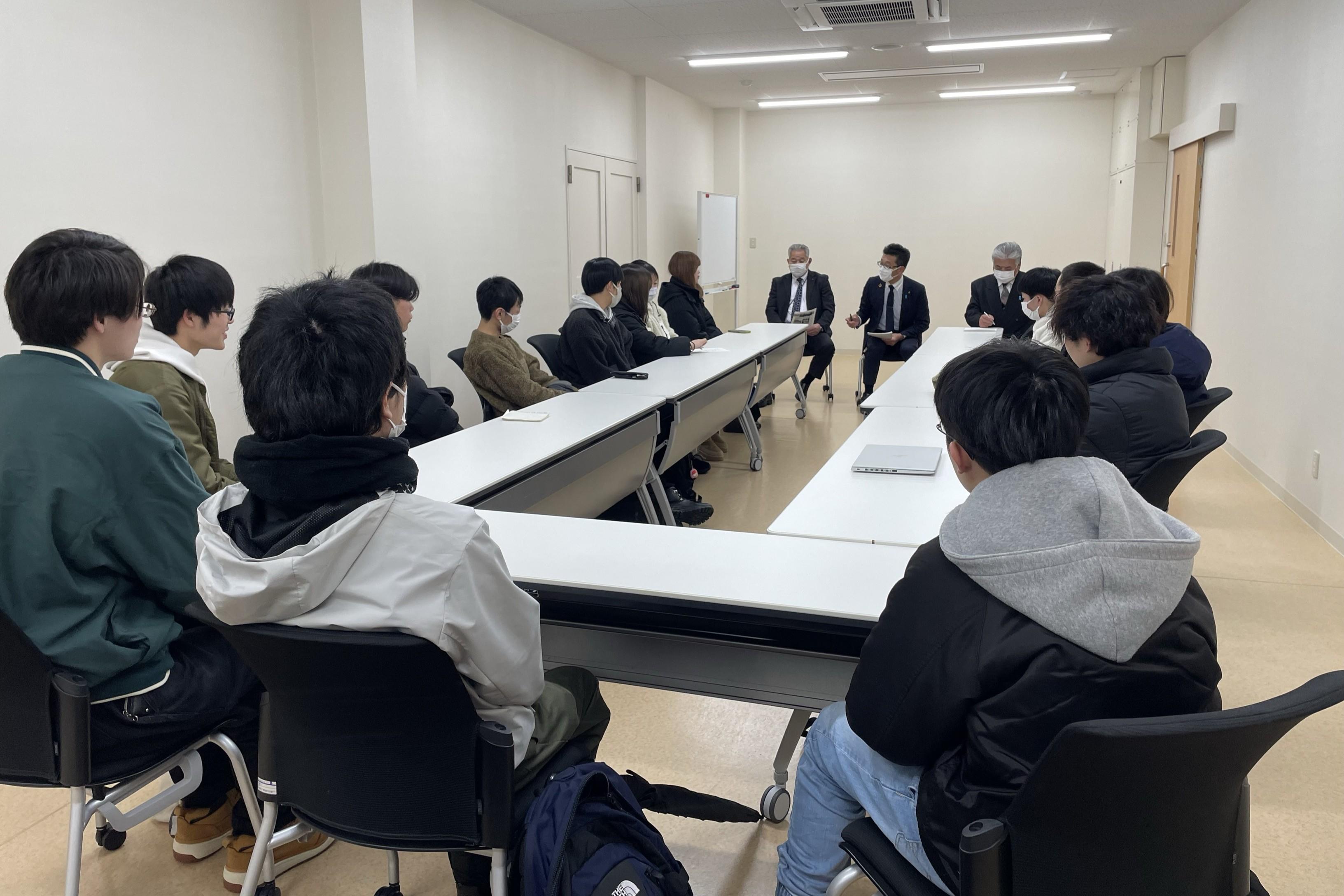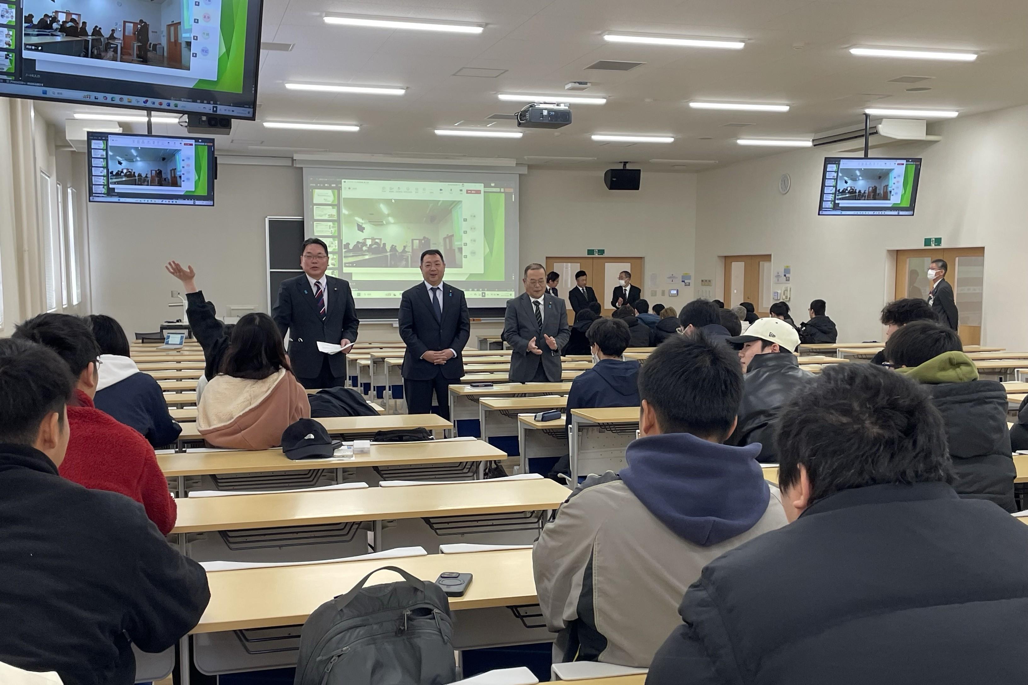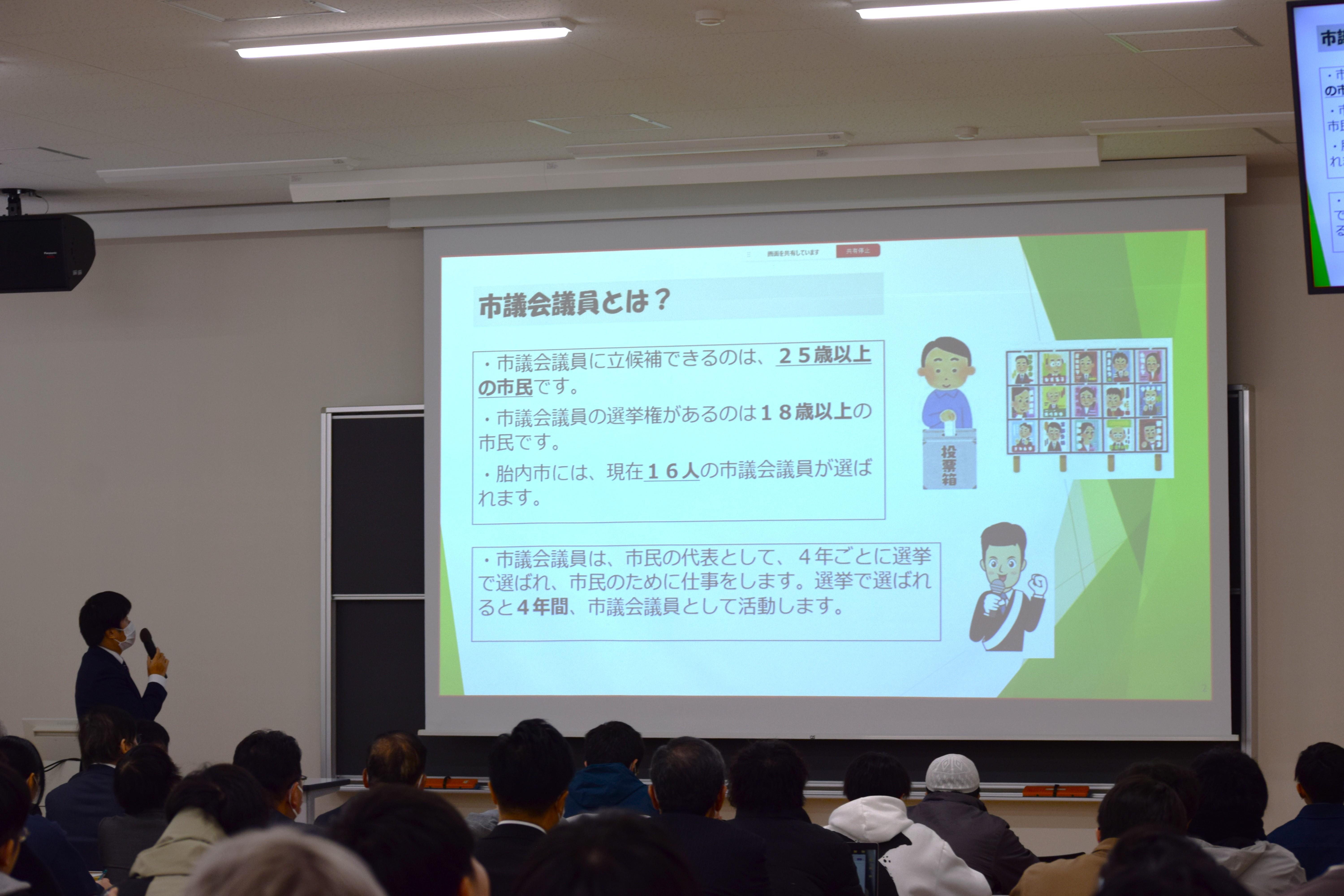 1/10(金)の授業では特別授業「主権者としての情報リテラシー」として、学生たちの主権者意識の向上・醸成を目的に、胎内市議会の皆様にお越しいただき「胎内市議会と市議会議員の役割」についてご講演いただいたのち、「胎内市をより良いまちにするには」というテーマでグループディスカッションを行いました。