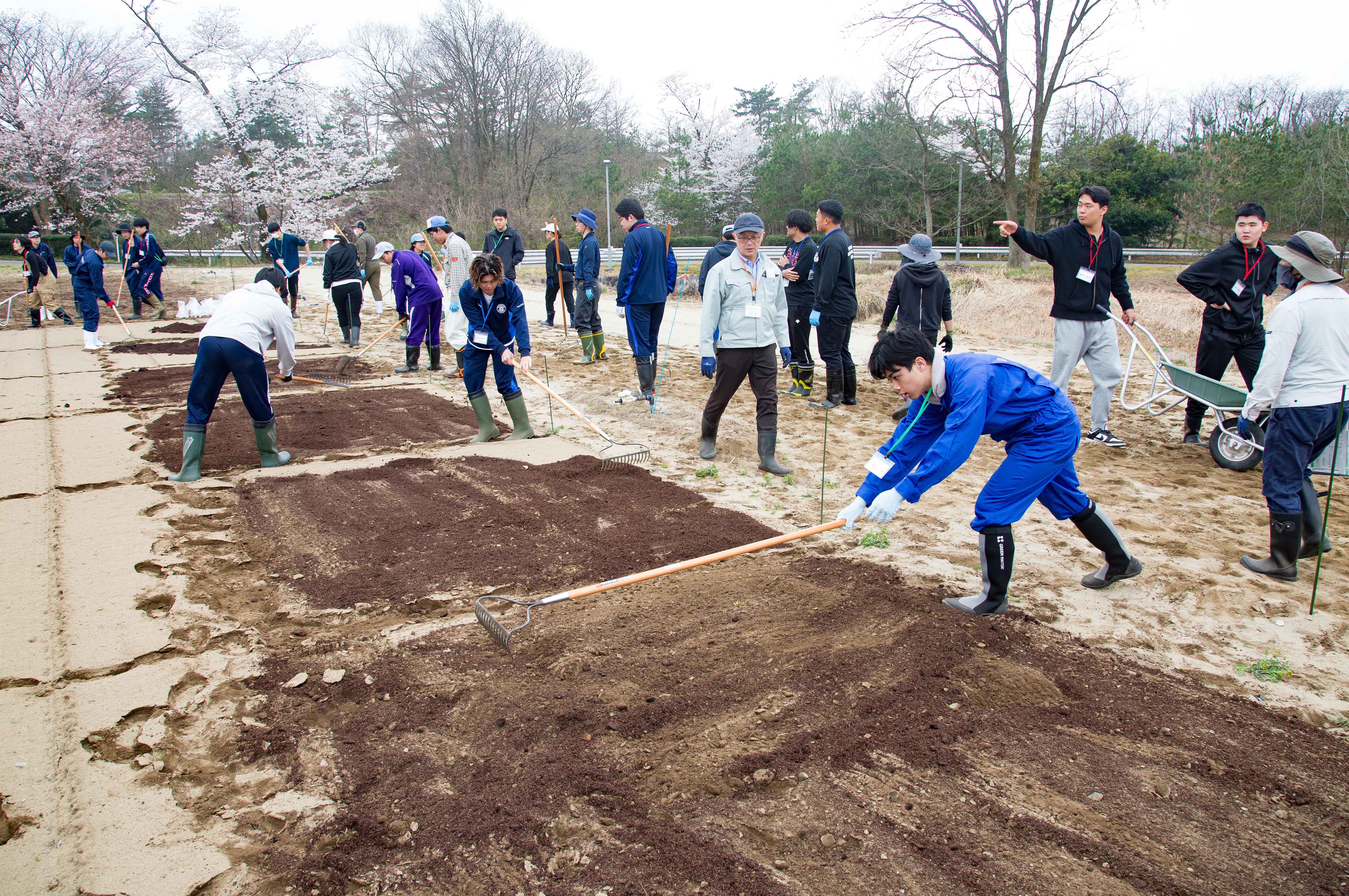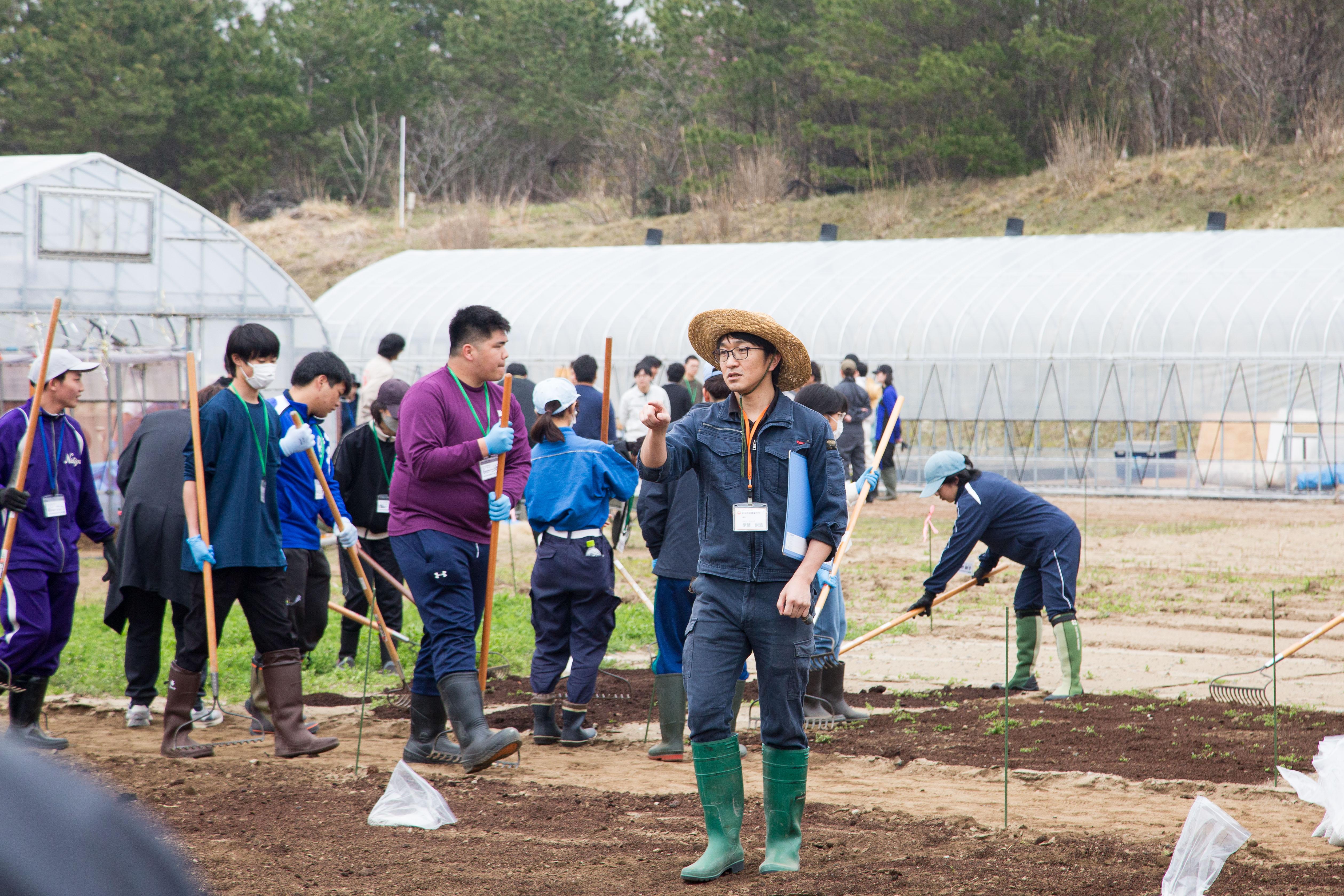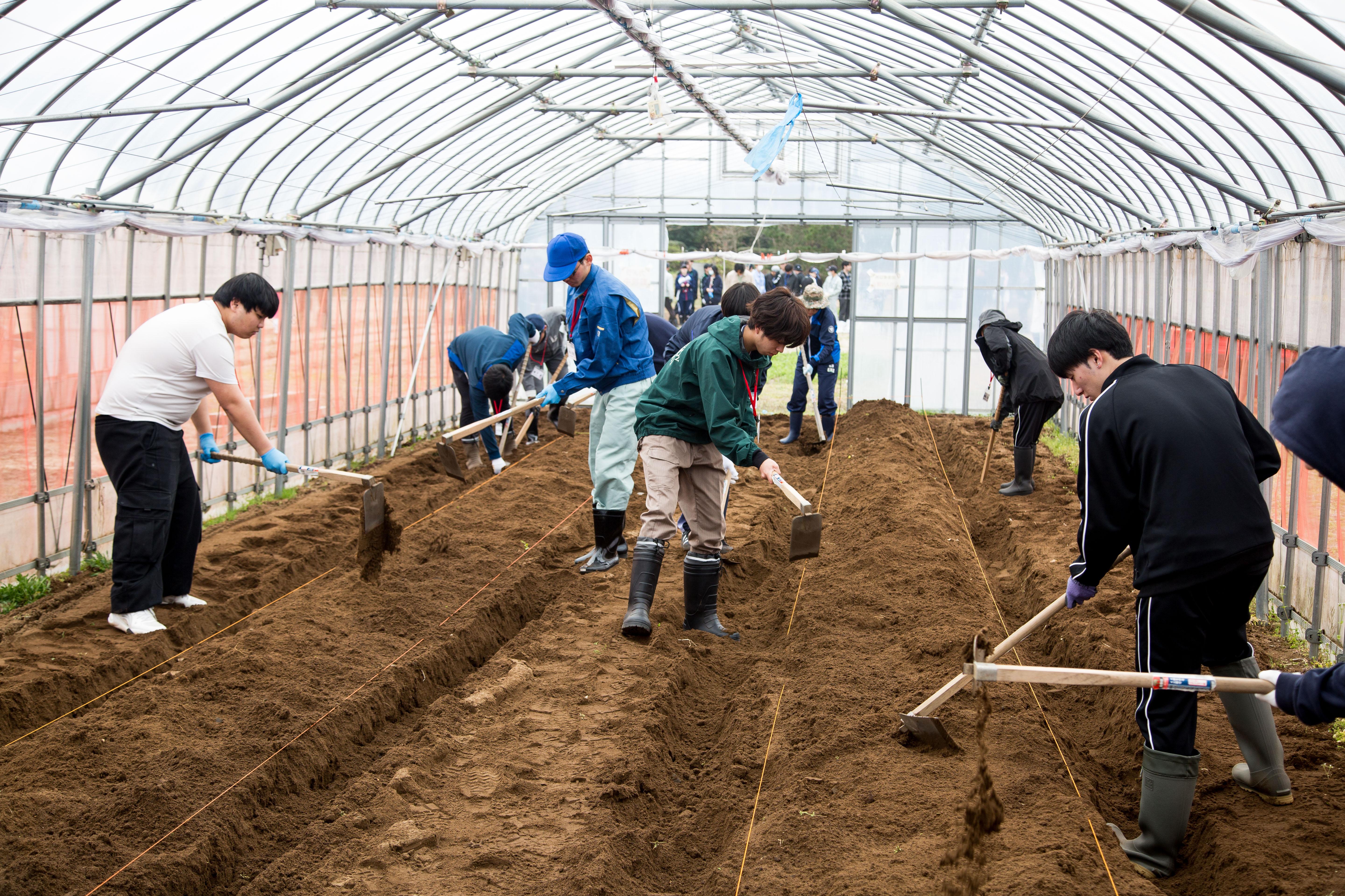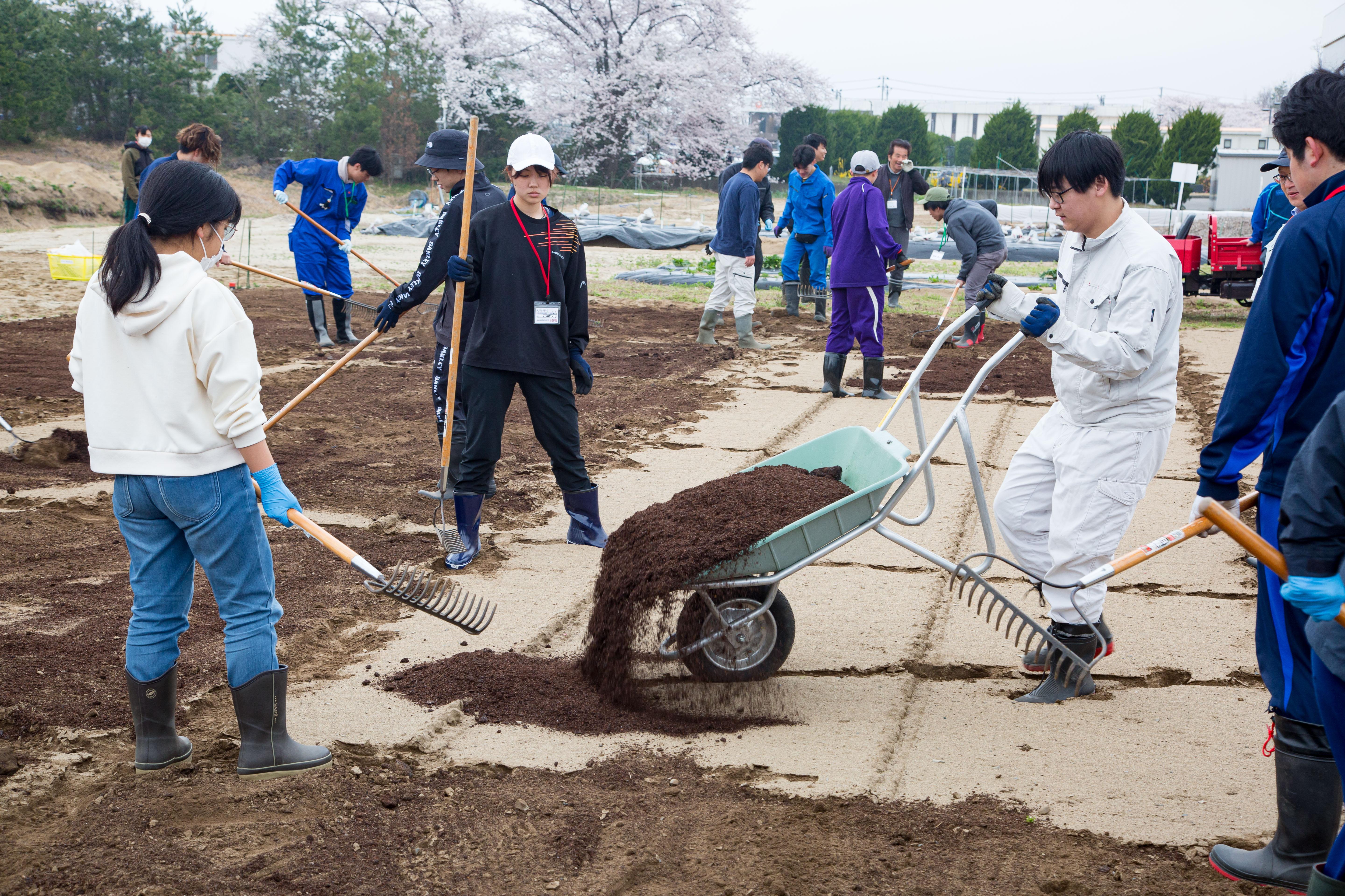 この授業(食料産業基礎実習)は、1年次必修科目であり通年授業です。土づくり、施肥、畝立て、マルチ張りからはじまり生育・根粒調査や病害虫の観察なども行い、7月ごろには農作物を収穫します。また、5月には田植え、9月には稲刈りも実習として実施します。