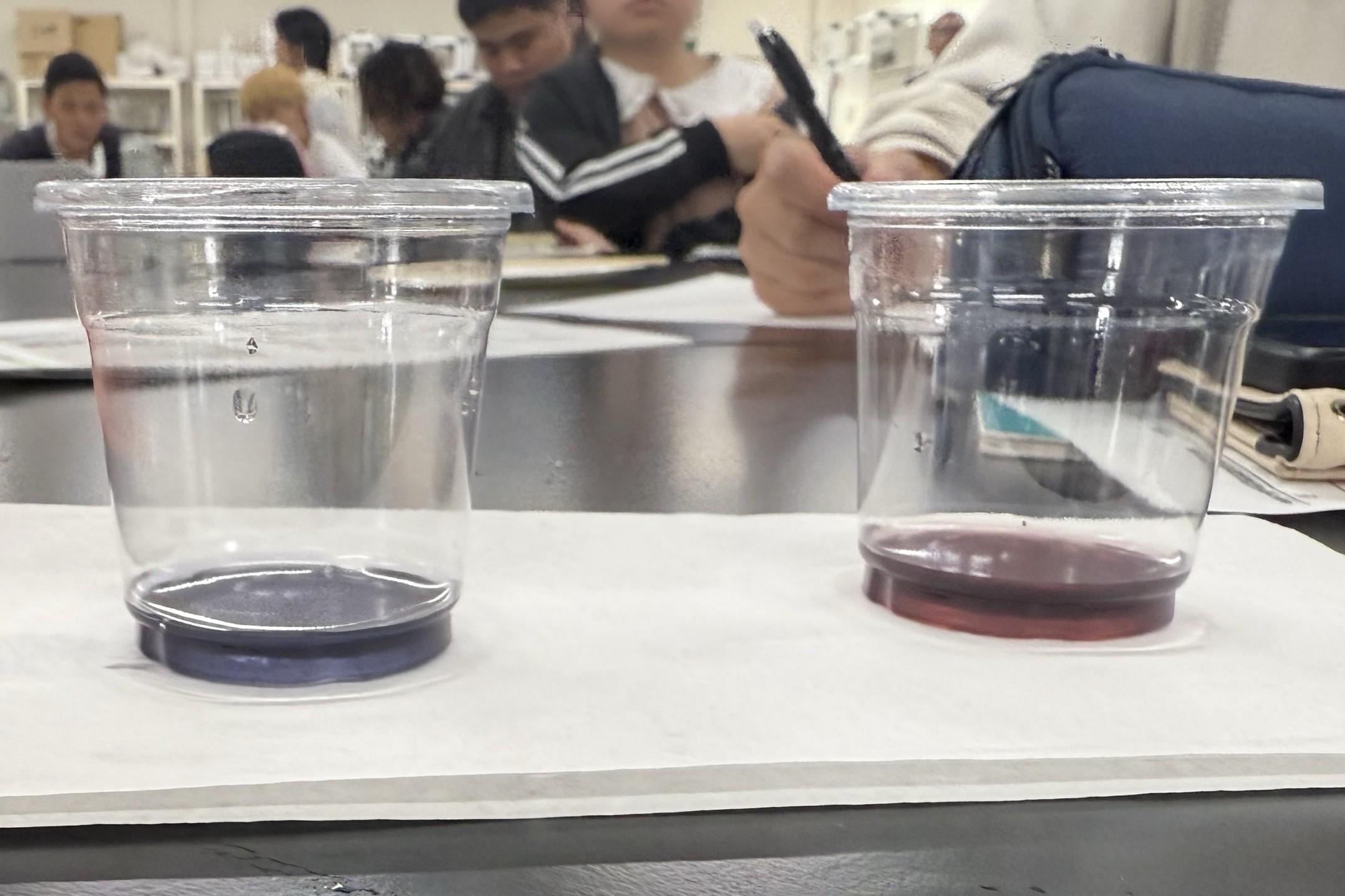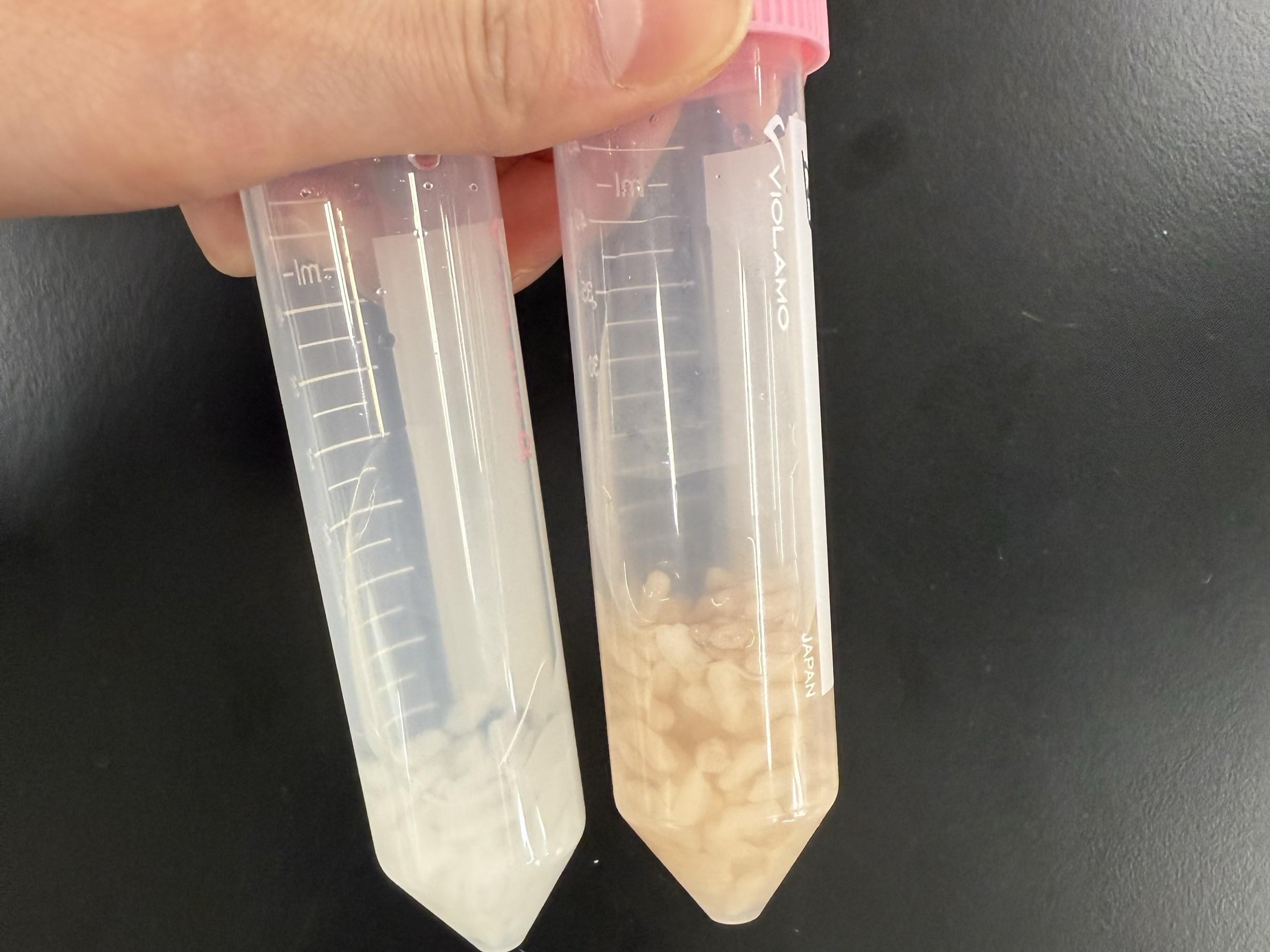 ヨウ素デンプン反応による色の違いはご覧の通り。(どちらがもち米か判りますか?)