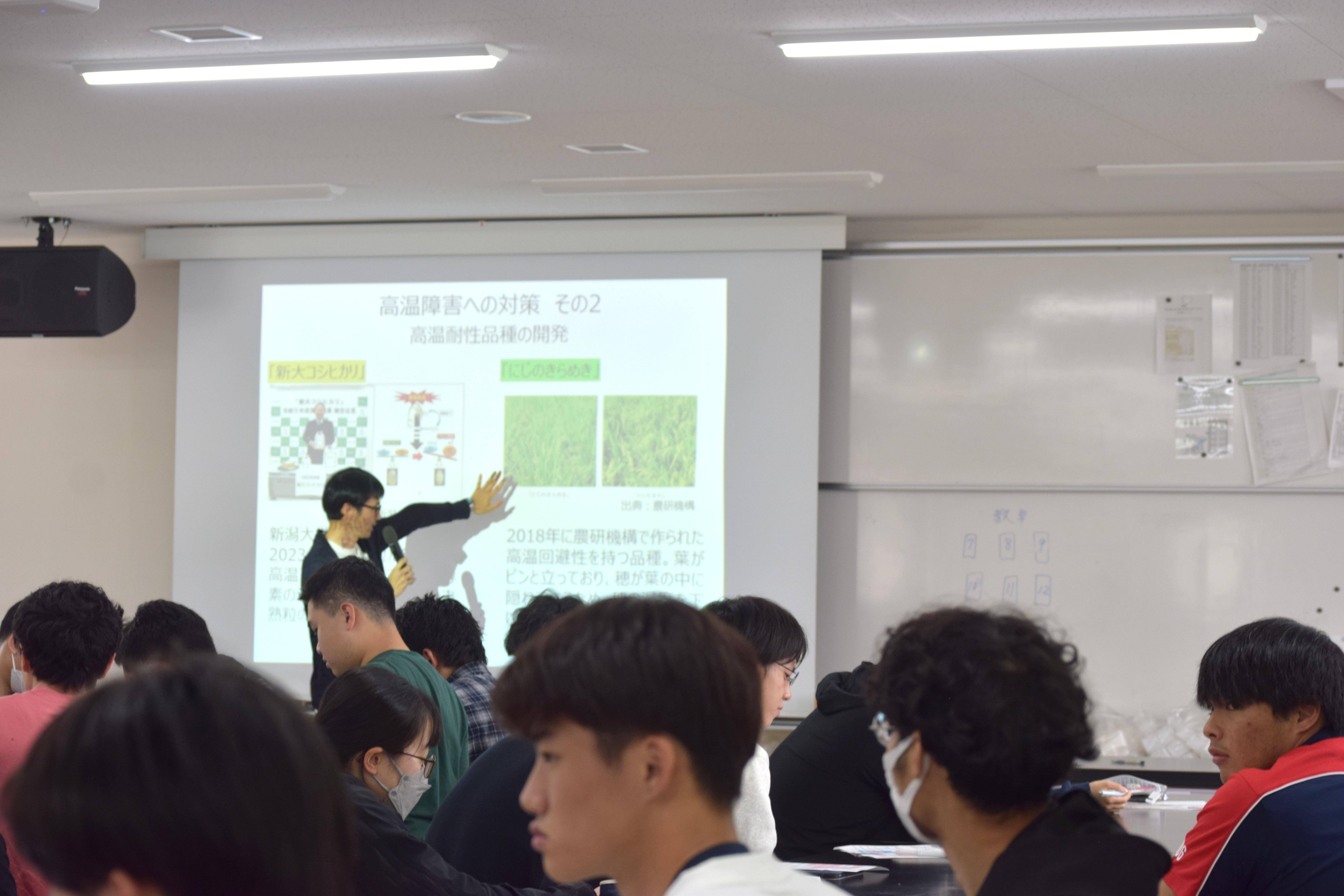 授業では白未熟粒の発生原因について解説し、高温障害への対策を紹介しました。