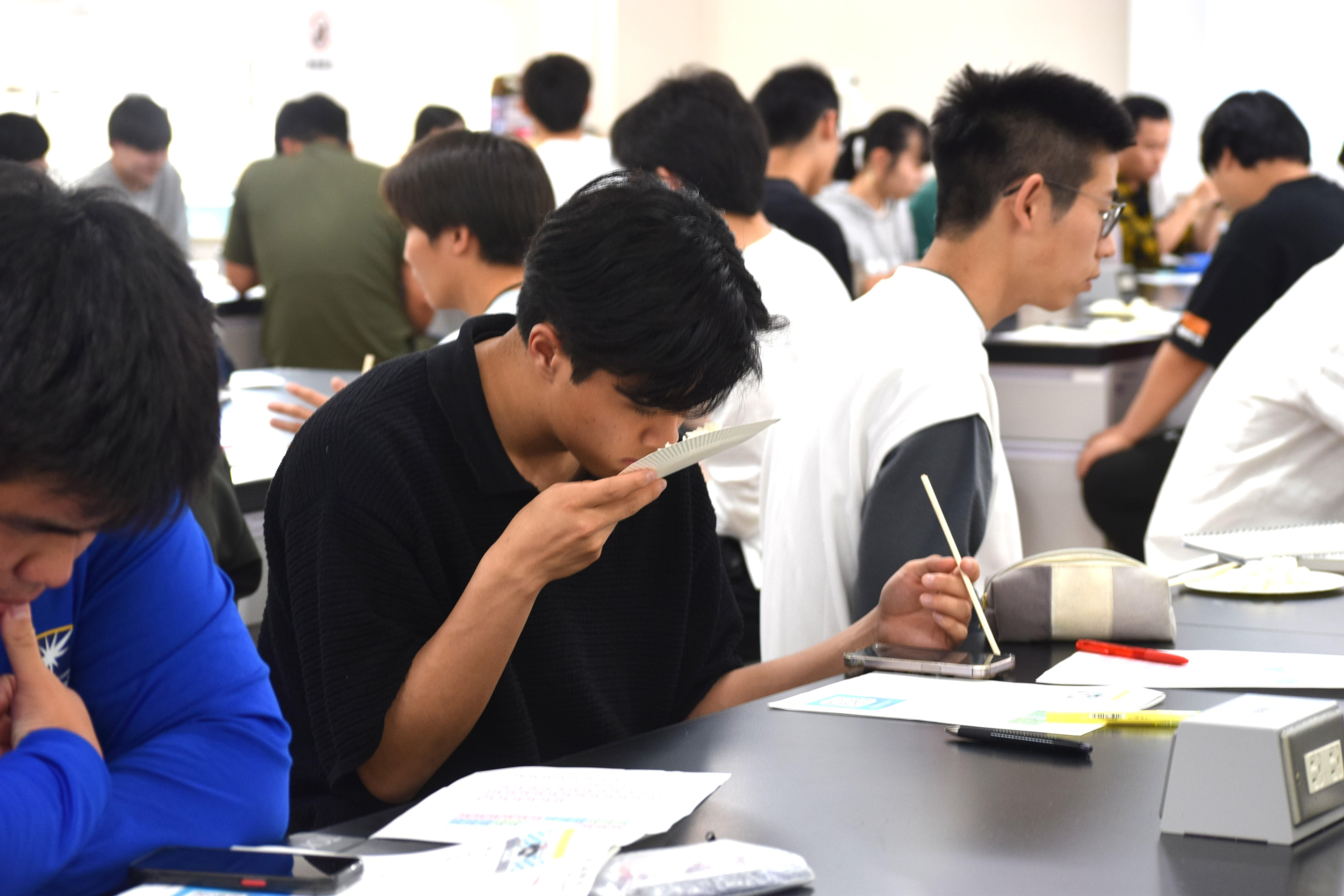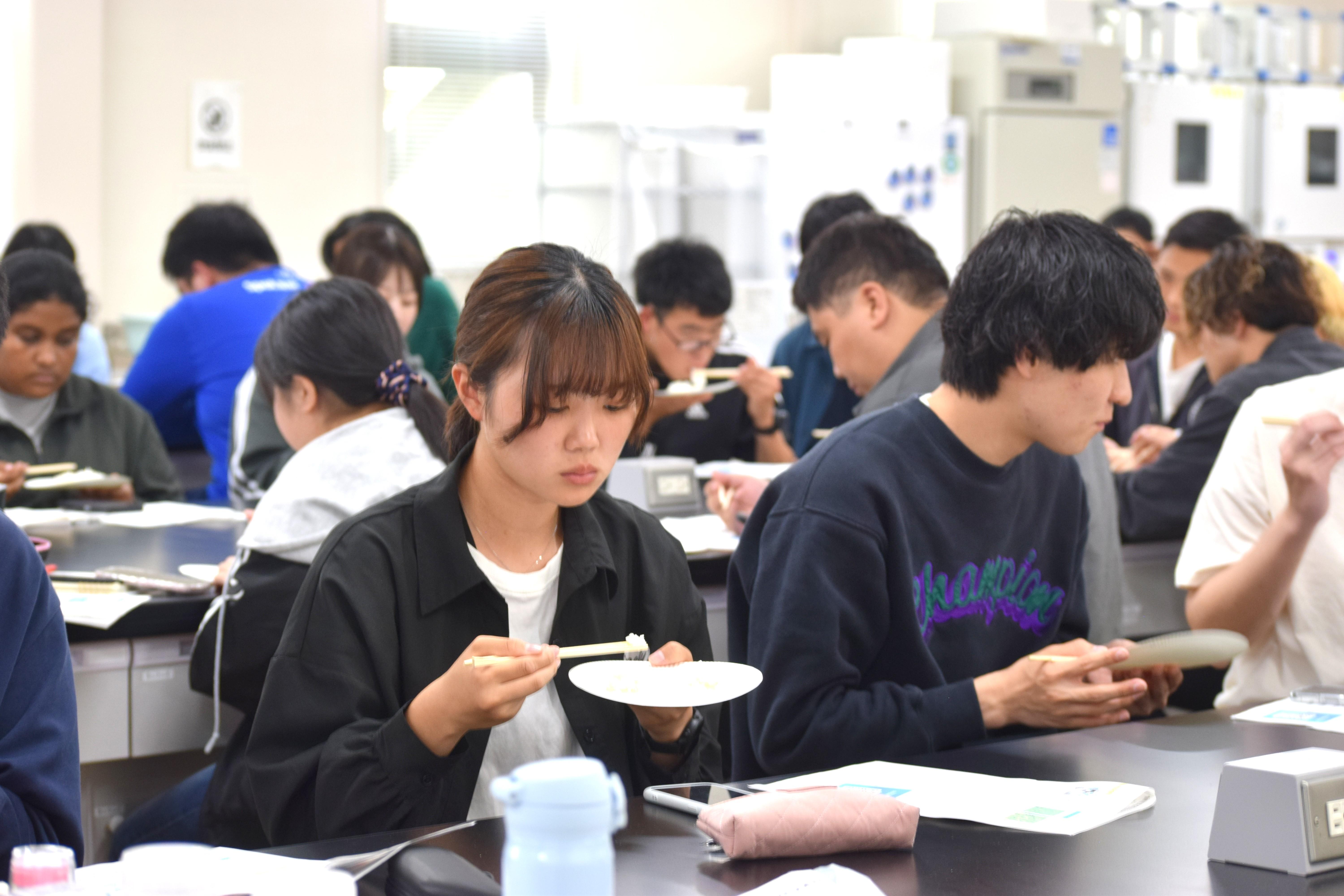 1年生の学生たちは、香りをかいだり、口に含んで噛んだりして粘りや味を真剣に比較していました。