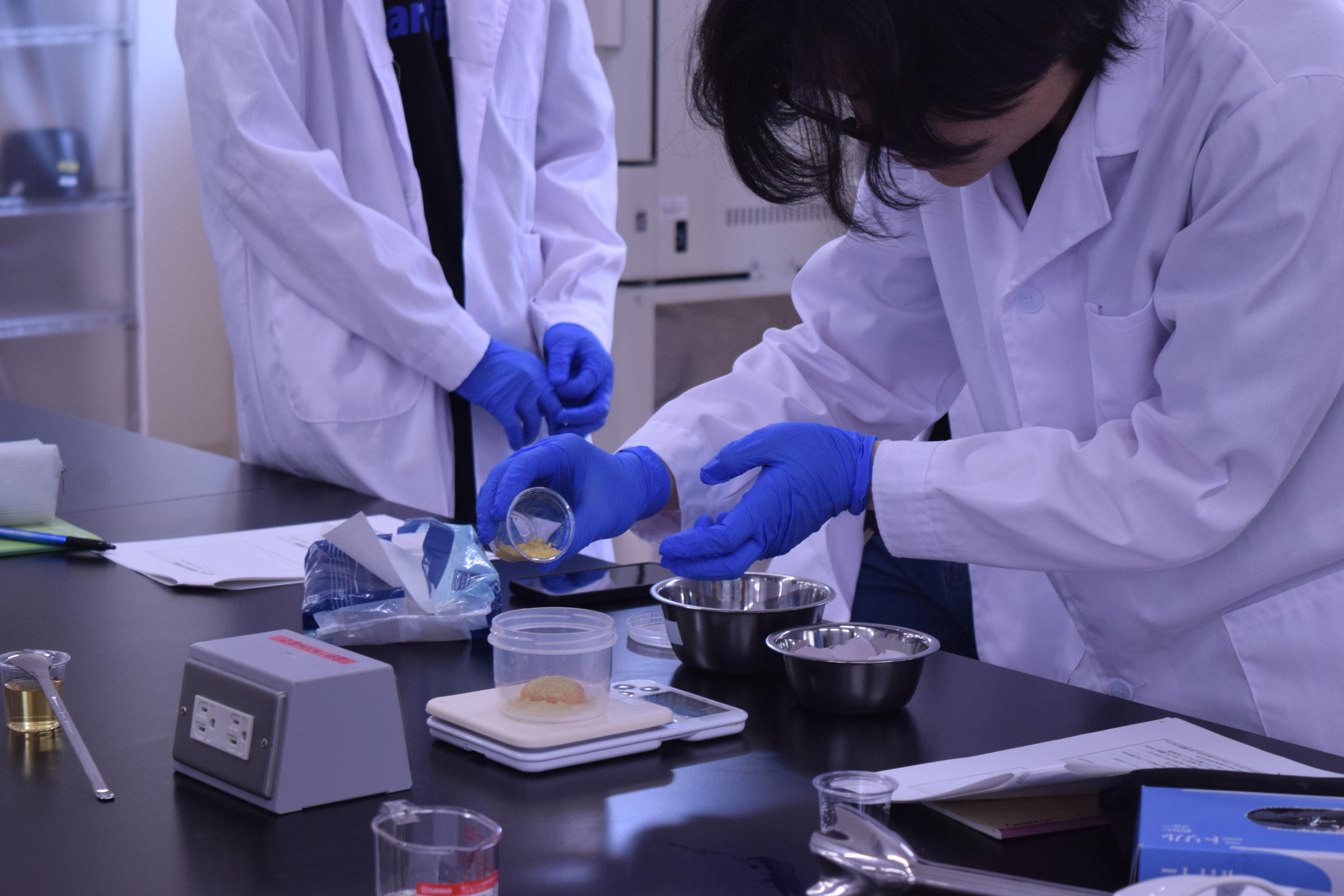 2年生フードコース必修科目「食品生産科学基礎実験・実習」では、各種の食品を実際に調理・加工・保存し、食品原料の特性、製造原理、製造方法、およびその取り扱いについて理解し、高校で学んだ化学、生物学、物理学などの基礎知識と食品製造の工程との関連を理解することを目的としています。