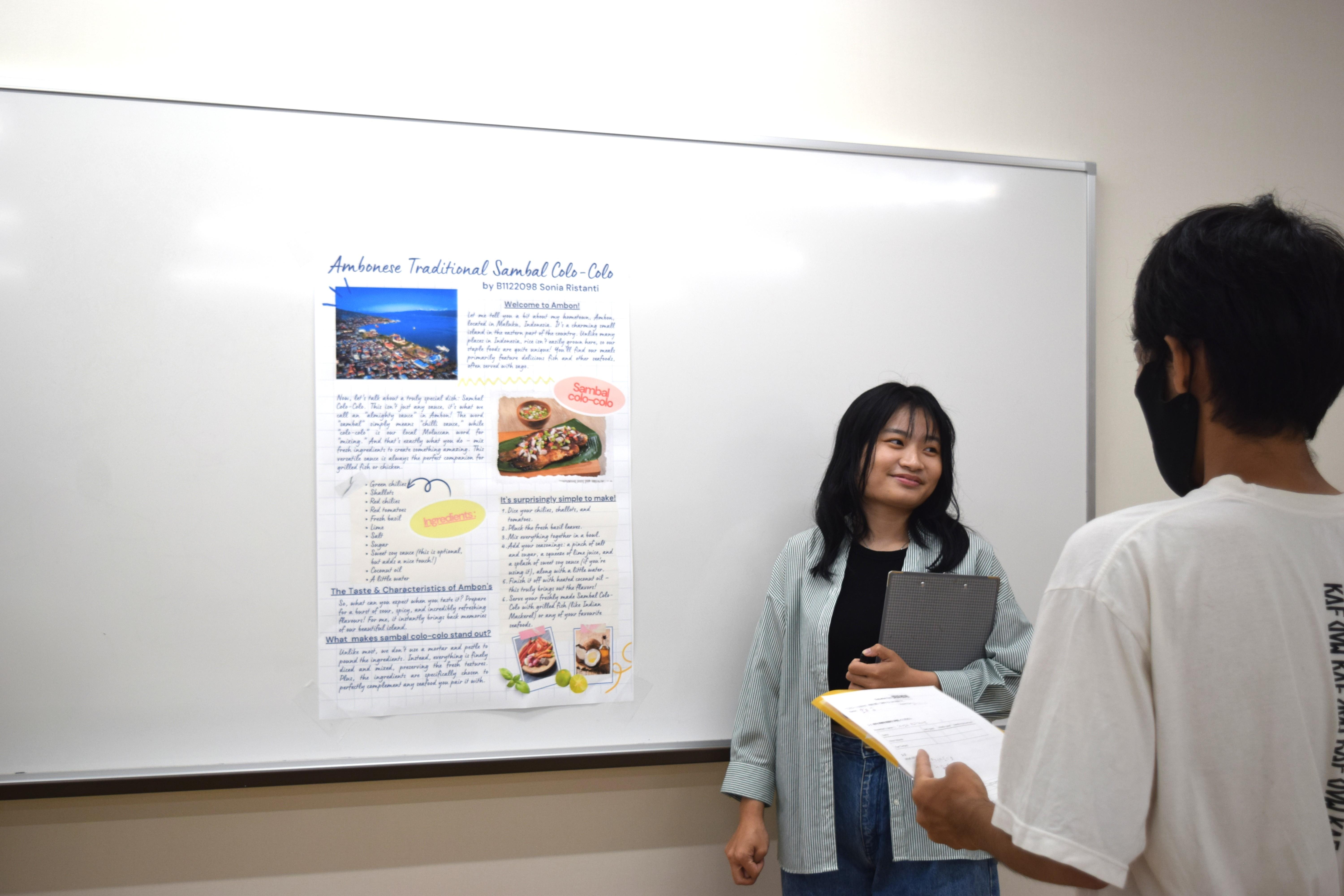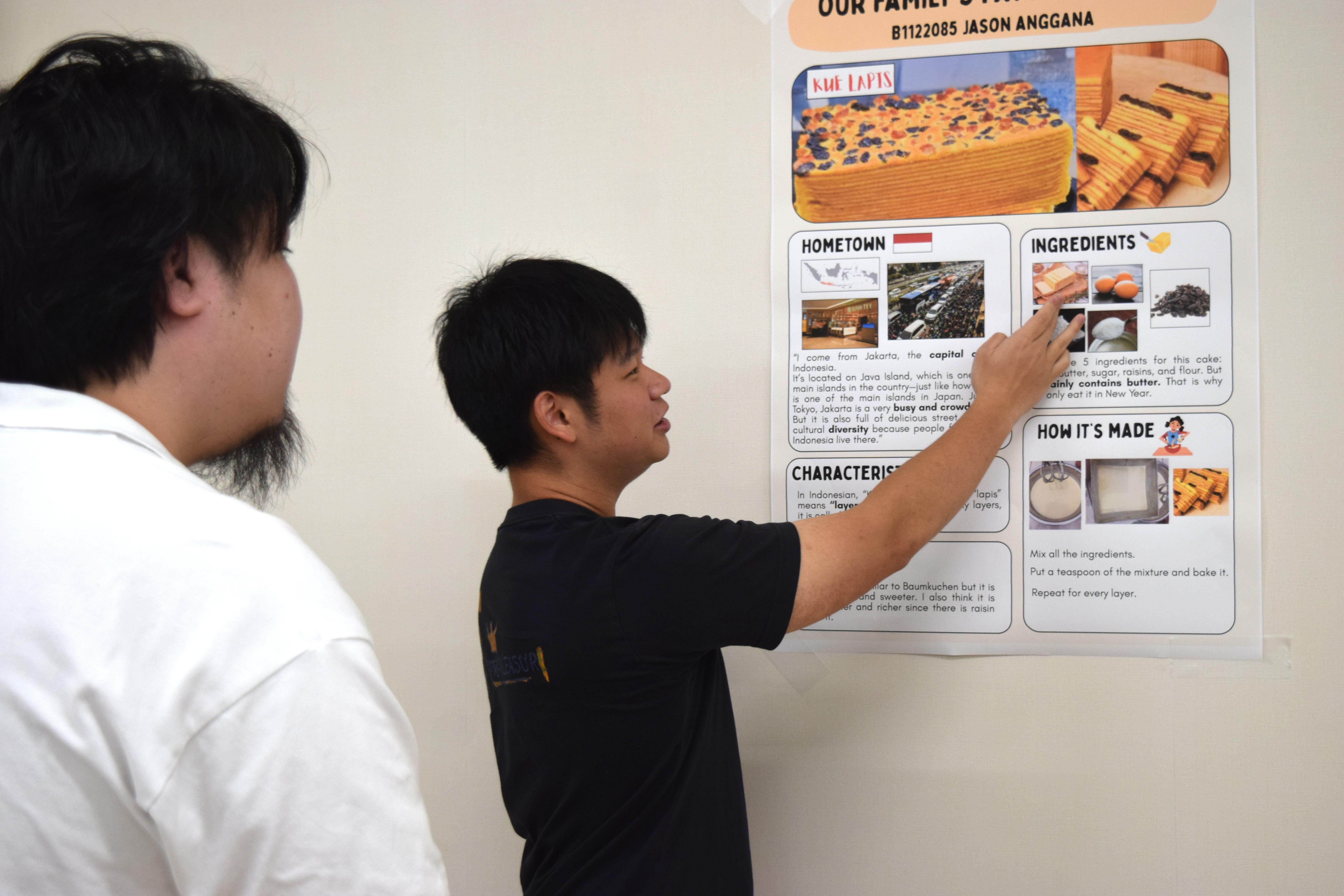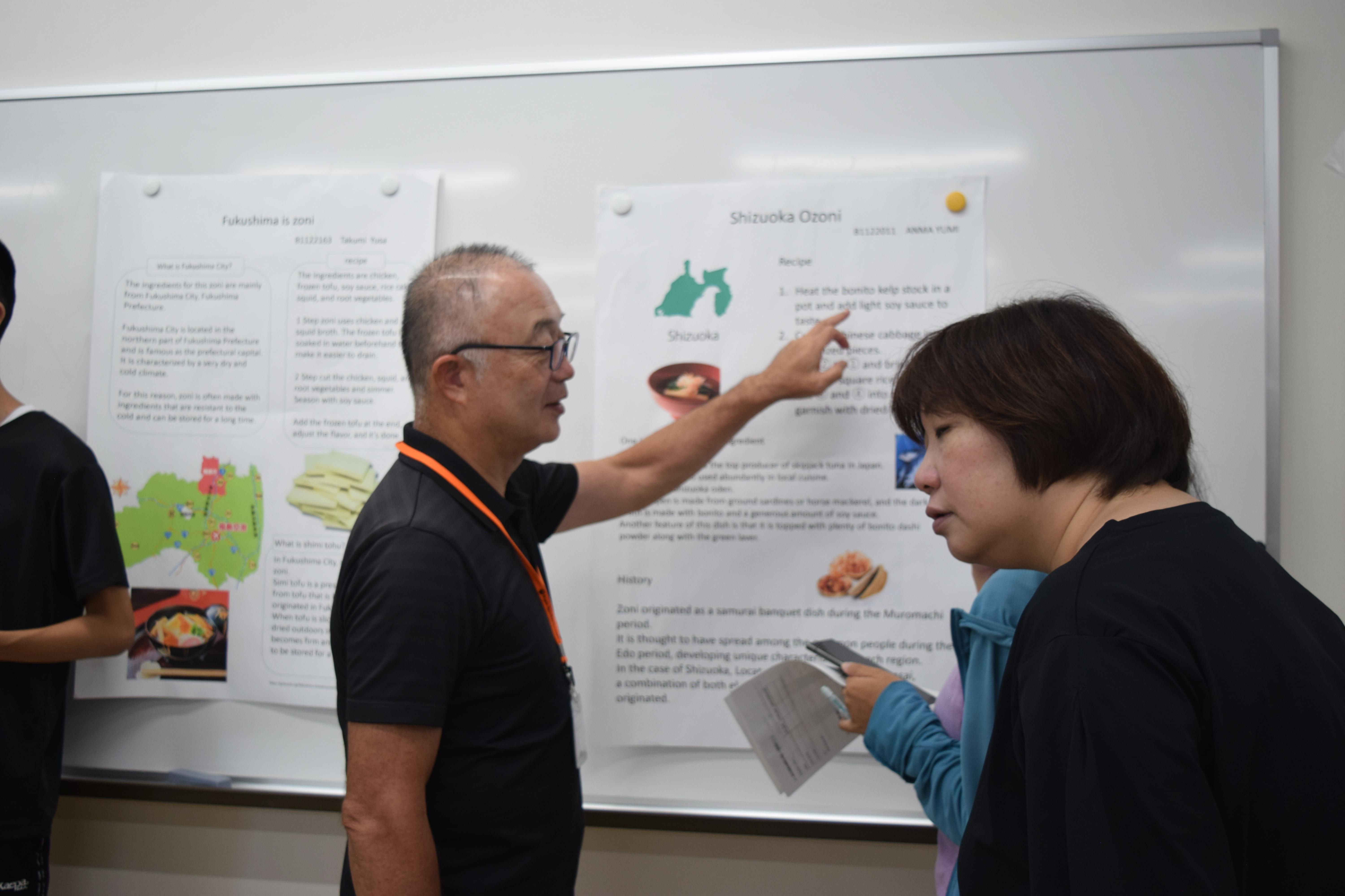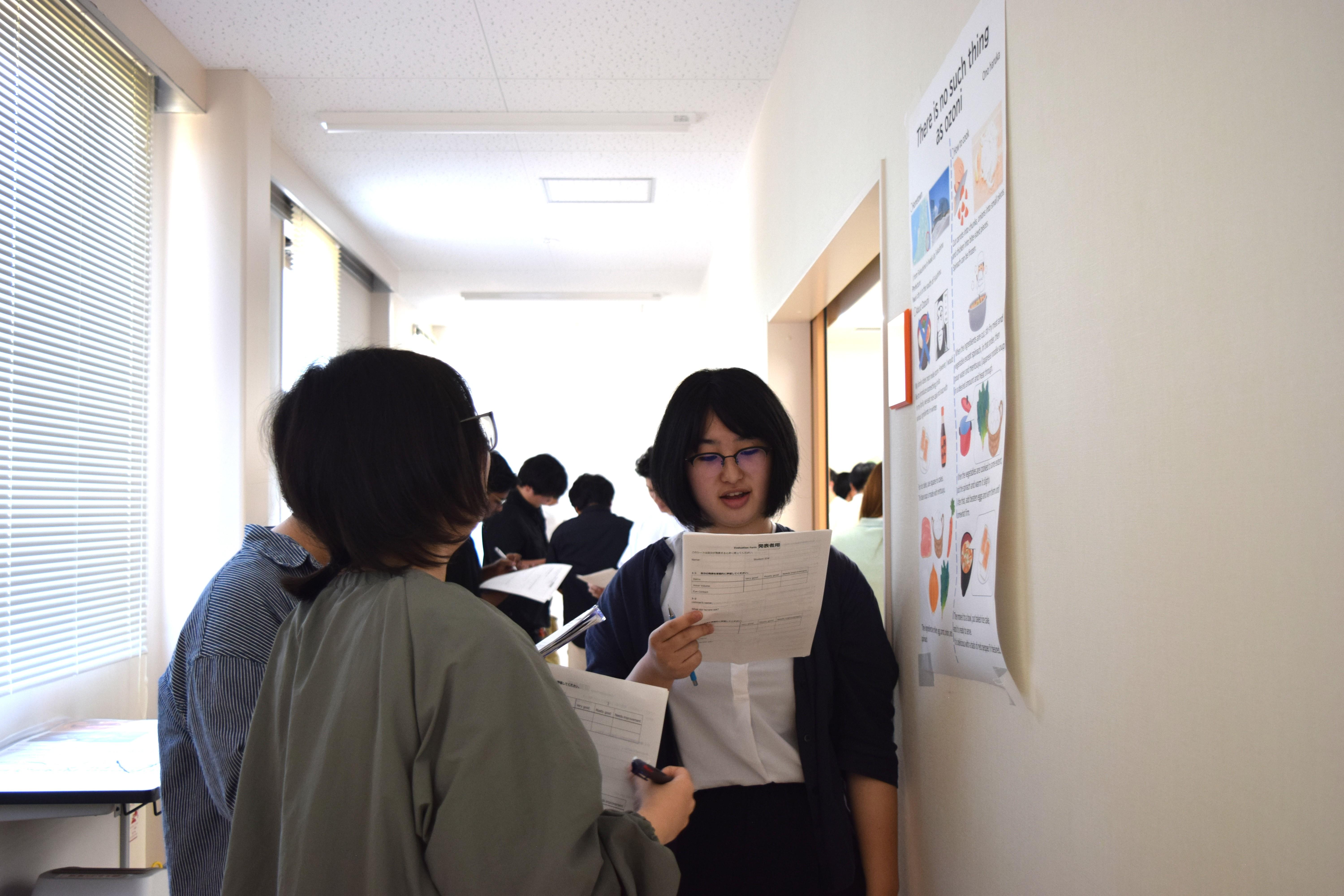 当日は他教科の教員や職員も見学に訪れ、学生たちの取り組みに耳を傾ける場面も見られました。英語を通して自分の文化を伝えると同時に、多様な「食」の背景に触れることで、多文化理解と表現力を深める貴重な機会となりました。