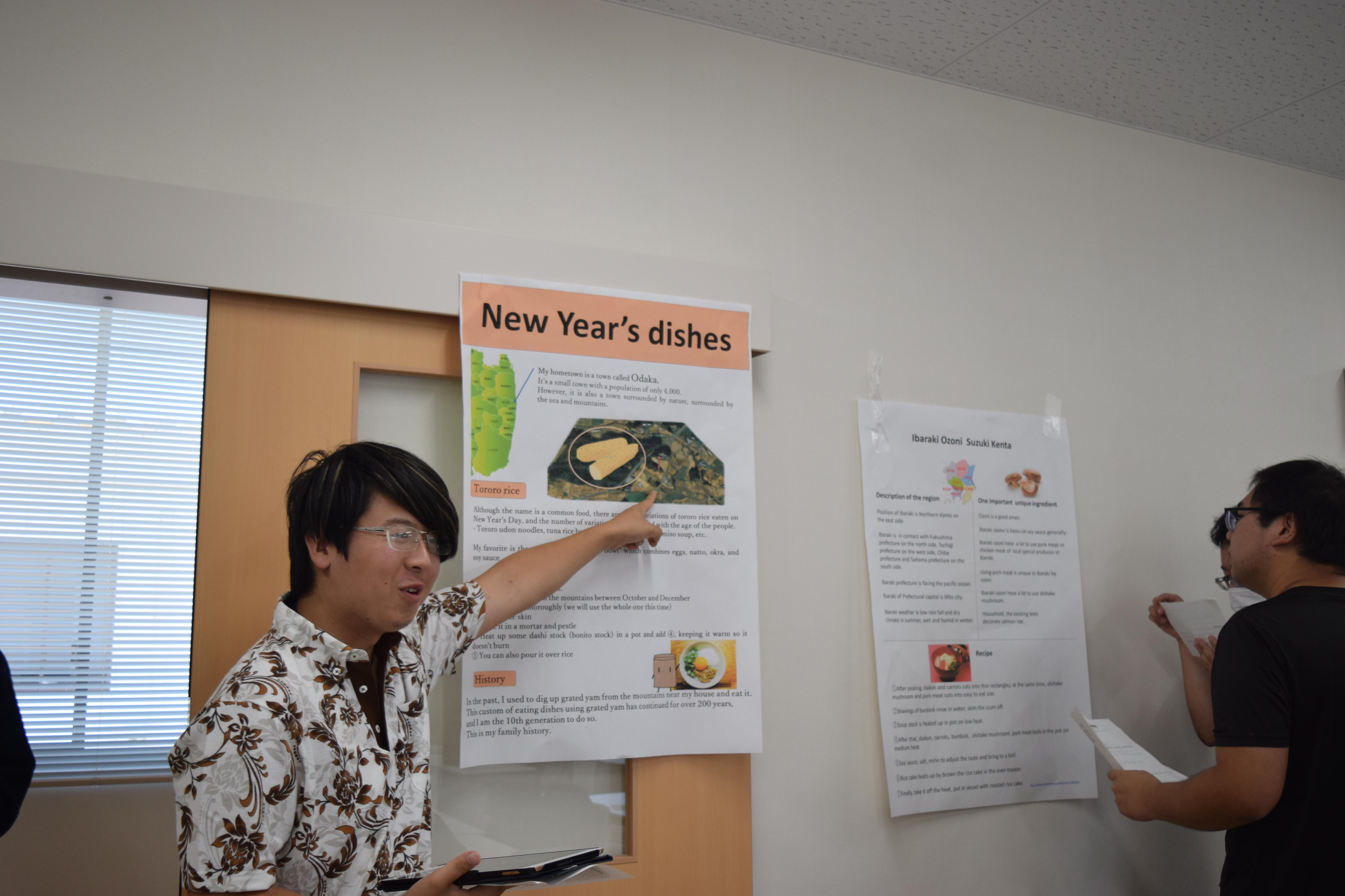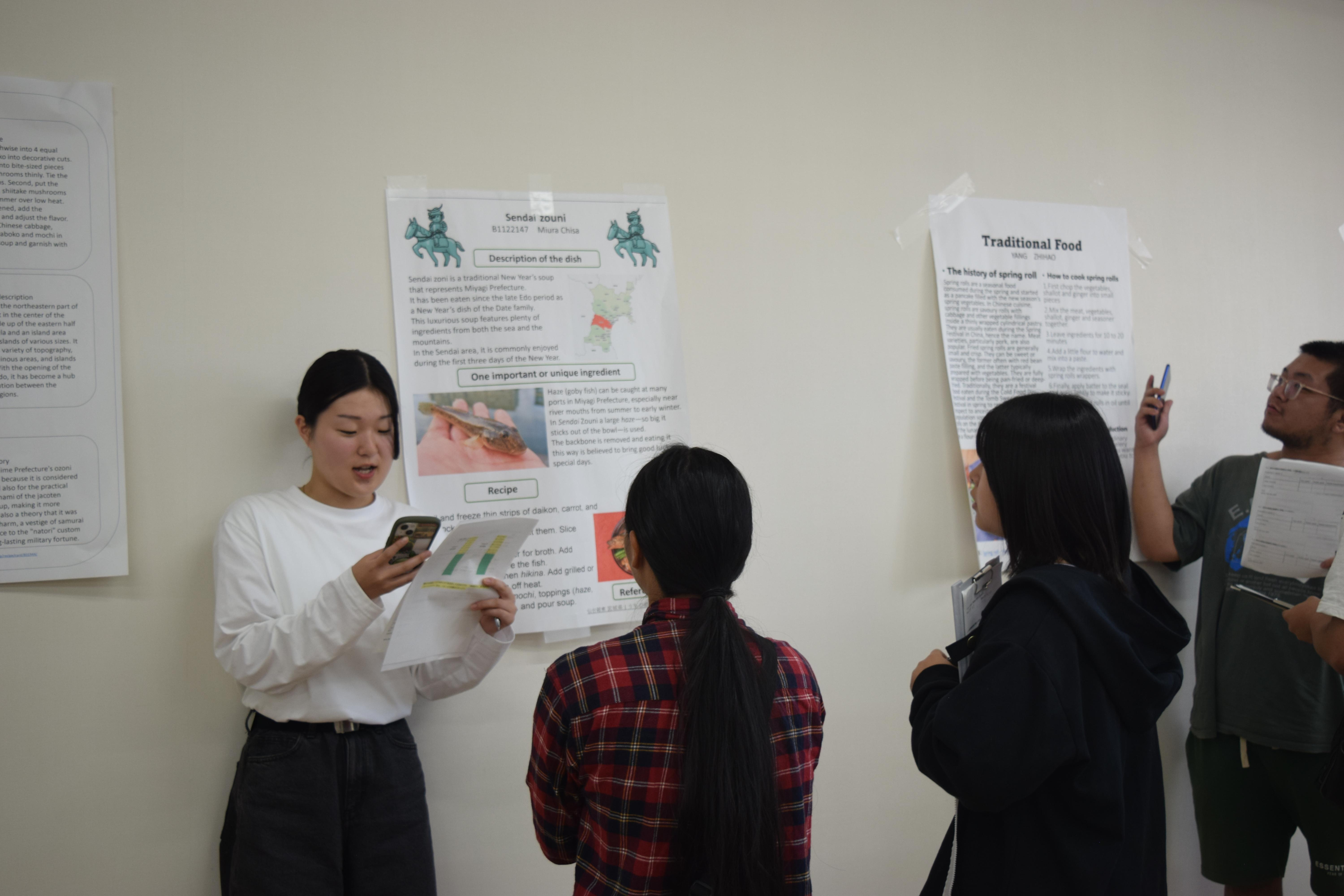 学生たちは、自分の出身地に伝わるお雑煮などについて、由来や特徴、作り方などを調べ、英語でポスターを作成し、発表を行いました。