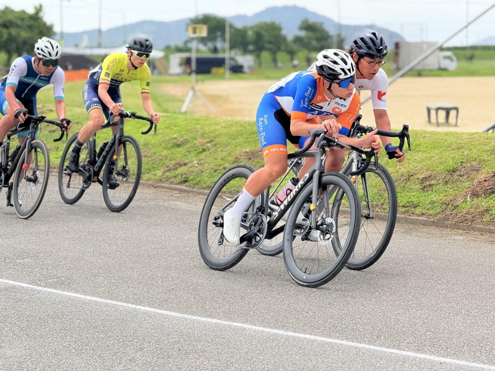 コースはコーナーが多く、立ち上がりとゴール前が向かい風でした。できる限り踏み込み、集団との差を広げることに注力しました。最初の4周近くは、自分の出せるワット数である約330Wで走りました。後半からは、後ろで温存していた同級生の長谷川選手に、向かい風の区間で踏んでもらい、一定のペースを保つことを意識して走りました。