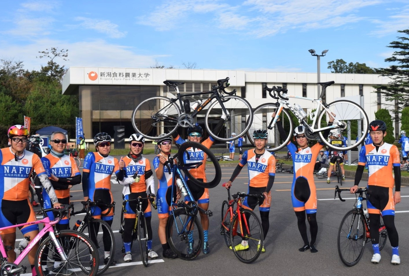 ツールド胎内2020。新潟食料農業大学胎内キャンパスにて自転車競技部サポートメンバーと。向かって左から2番目が筆者