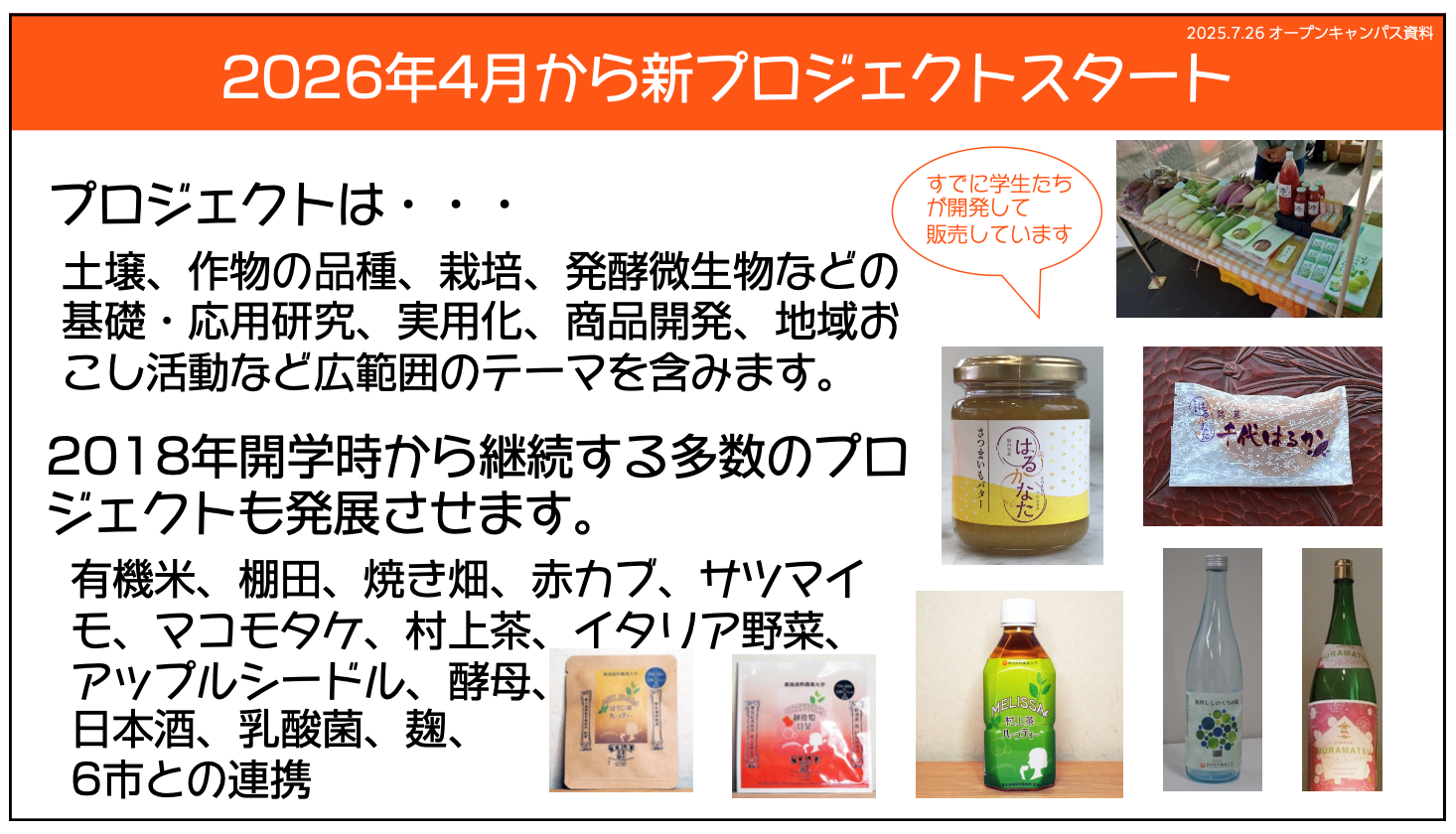 胎内市で生産していたサツマイモに一品種である「べにはるか」のブランディングも成功しています。胎内市とJA胎内市根菜部会と連携して、栽培方法や熟成方法を検討し、「はるかなた」と名付けました。栽培方法、熟成方法、販売方法など、卒業論文研究のテーマにも取り上げて、アグリ、フード、ビジネスの分野から多数の学生と教員が関わって研究開発してきました。