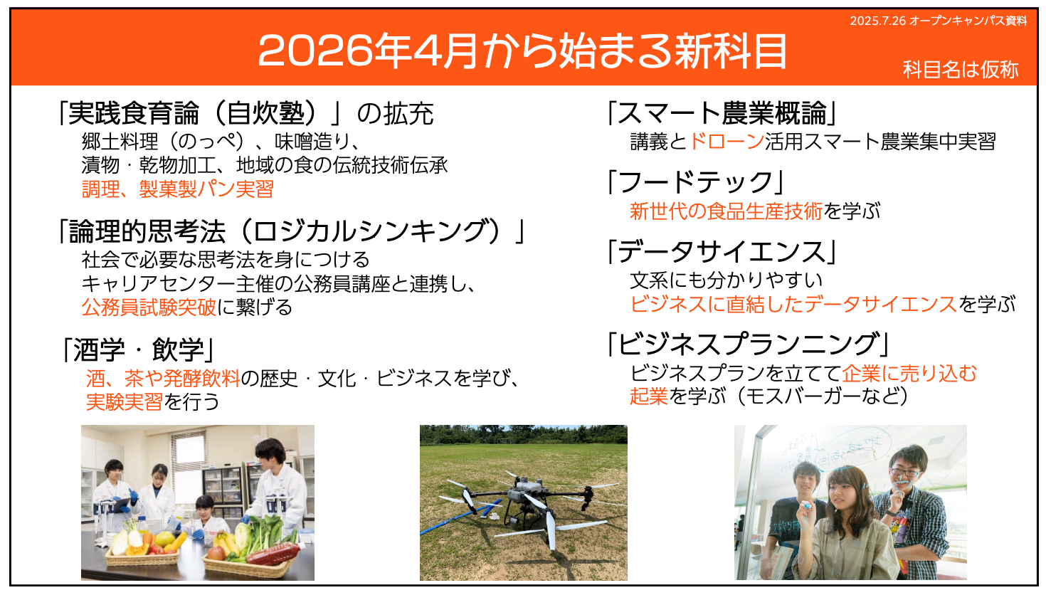 おもな科目のリニューアル内容は、「調理・製菓・製パン」、「酒・茶・発酵飲料の歴史・文化・製造・ビジネス」、「スマート農業」、「フードテック(新世代の食品生産技術)」、「ビジネスに直結したデータサイエンス」、「ビジネスプラン立て企業に売り込む」などです。これらの新しいことを、実験・実習やグループワークを通して、体験的に学びます。