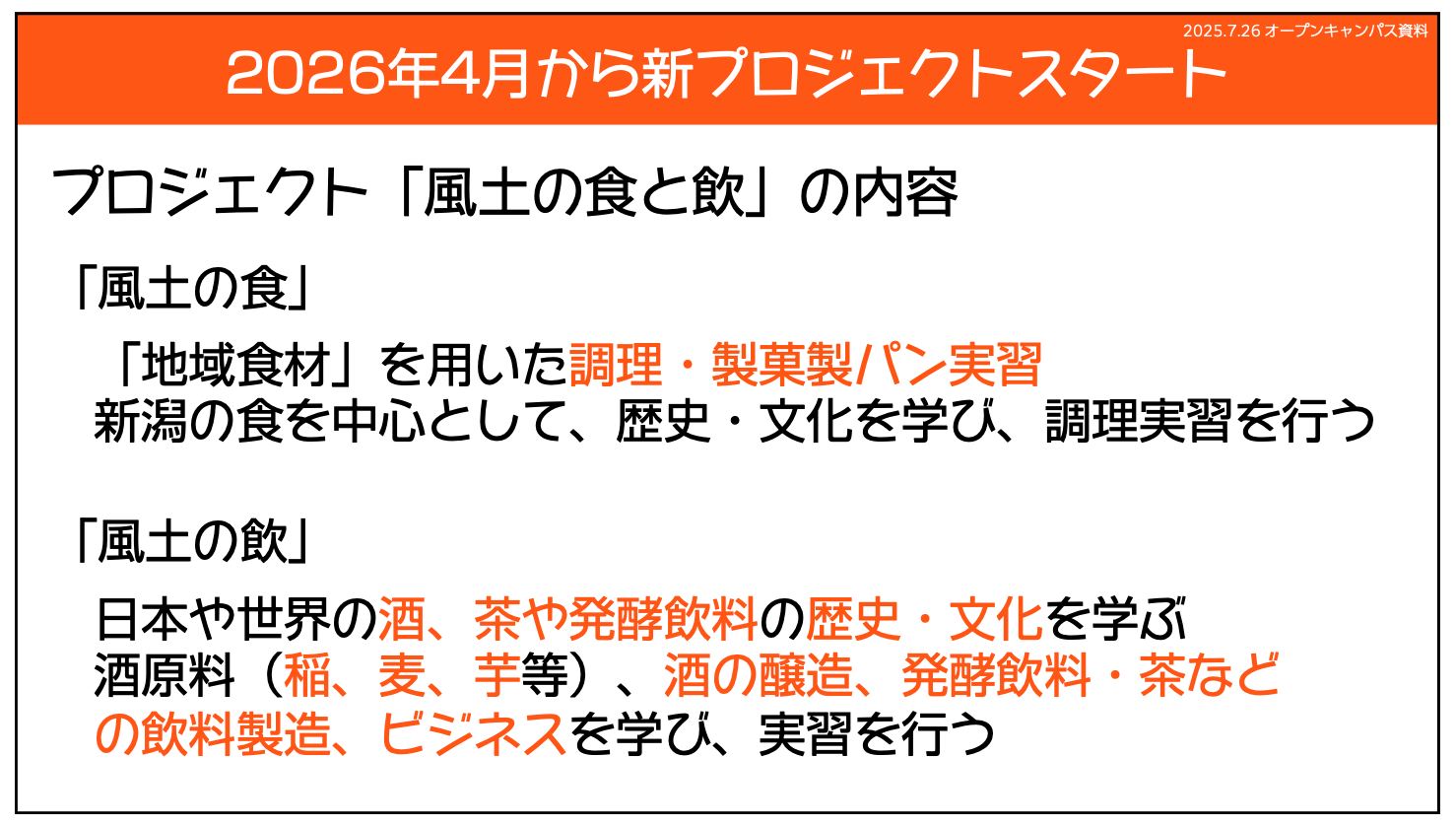 本学は、2026年度から、フードチェーン、マーケットイン、地域という三点の概念を更に深化させることにしました。それぞれの内容とともに、この三点の融合を深めます。これを科目のリニューアルと新たなプロジェクトに反映させます。