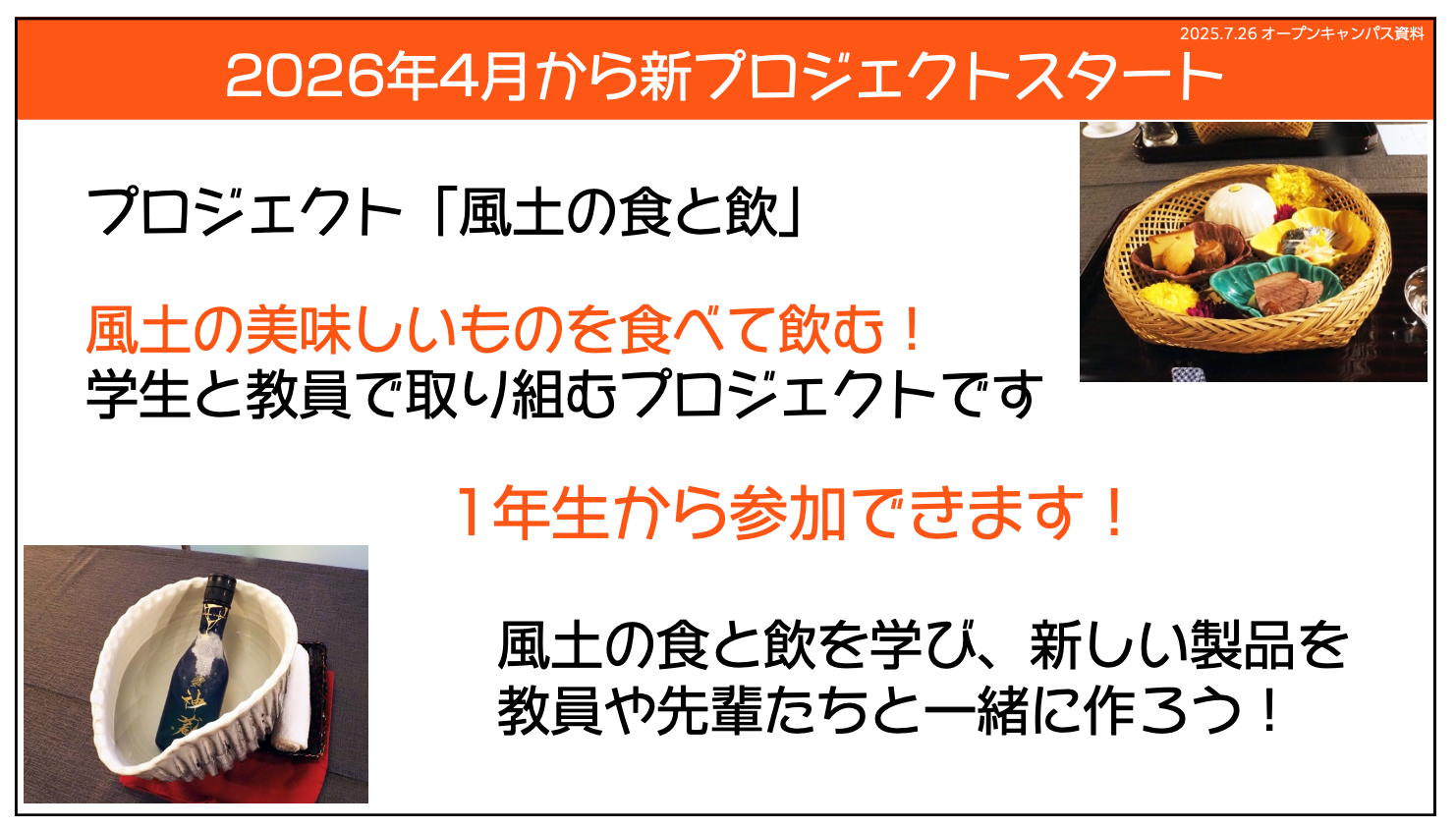 本学は、「テロワール・ガストロノミー」すなわち「風土の美食学」の学問構築を目指しながら、「風土の食と飲」を発信して行きたいと思います。