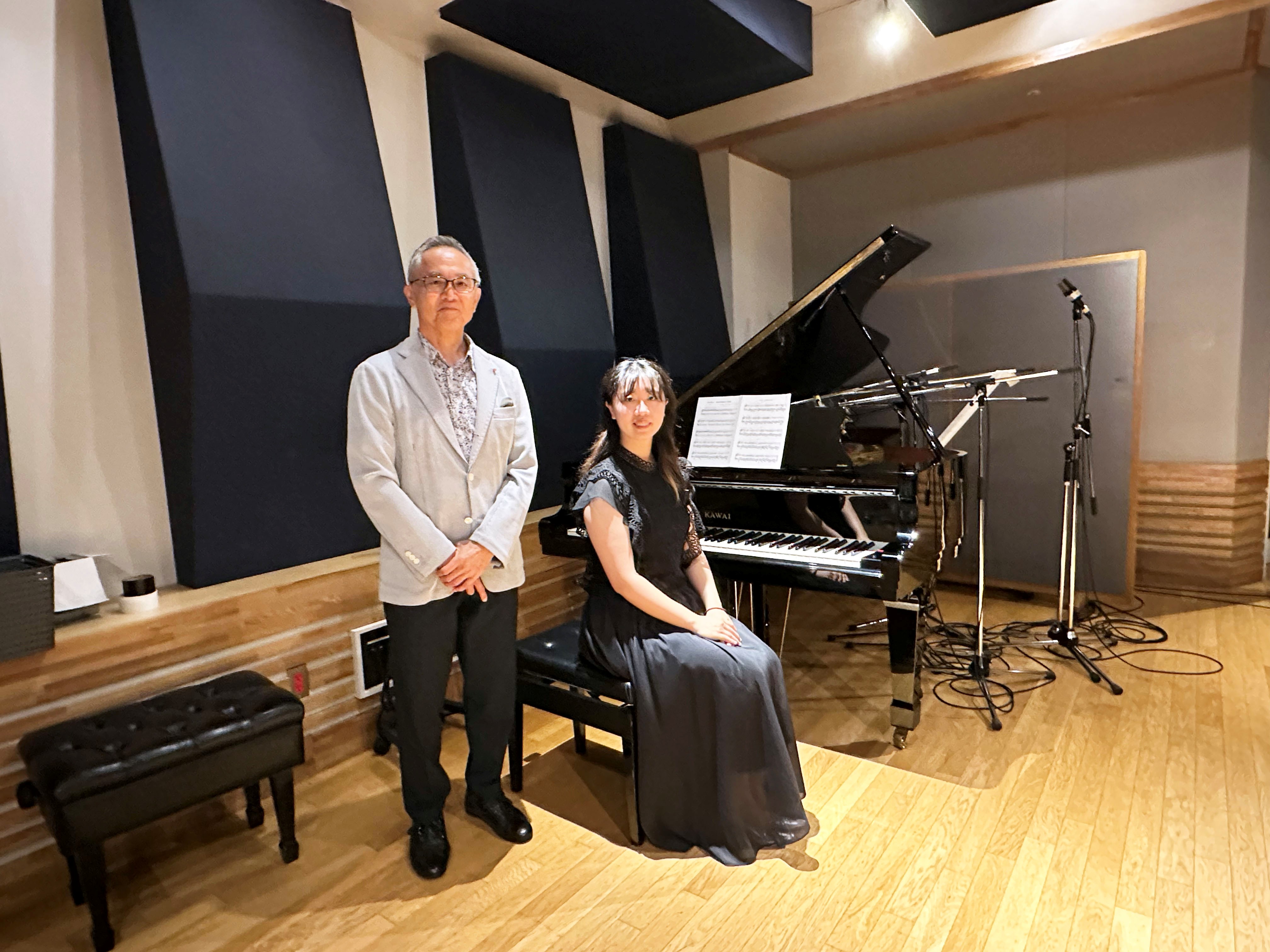 ピアノ録音は、8月8日にSHOW!の音楽スタジオで行われました。カワイのピアノはこのために調律され、その周りに複数のマイクが立ち並び、本格的な録音スタジオの風景に驚かされました。