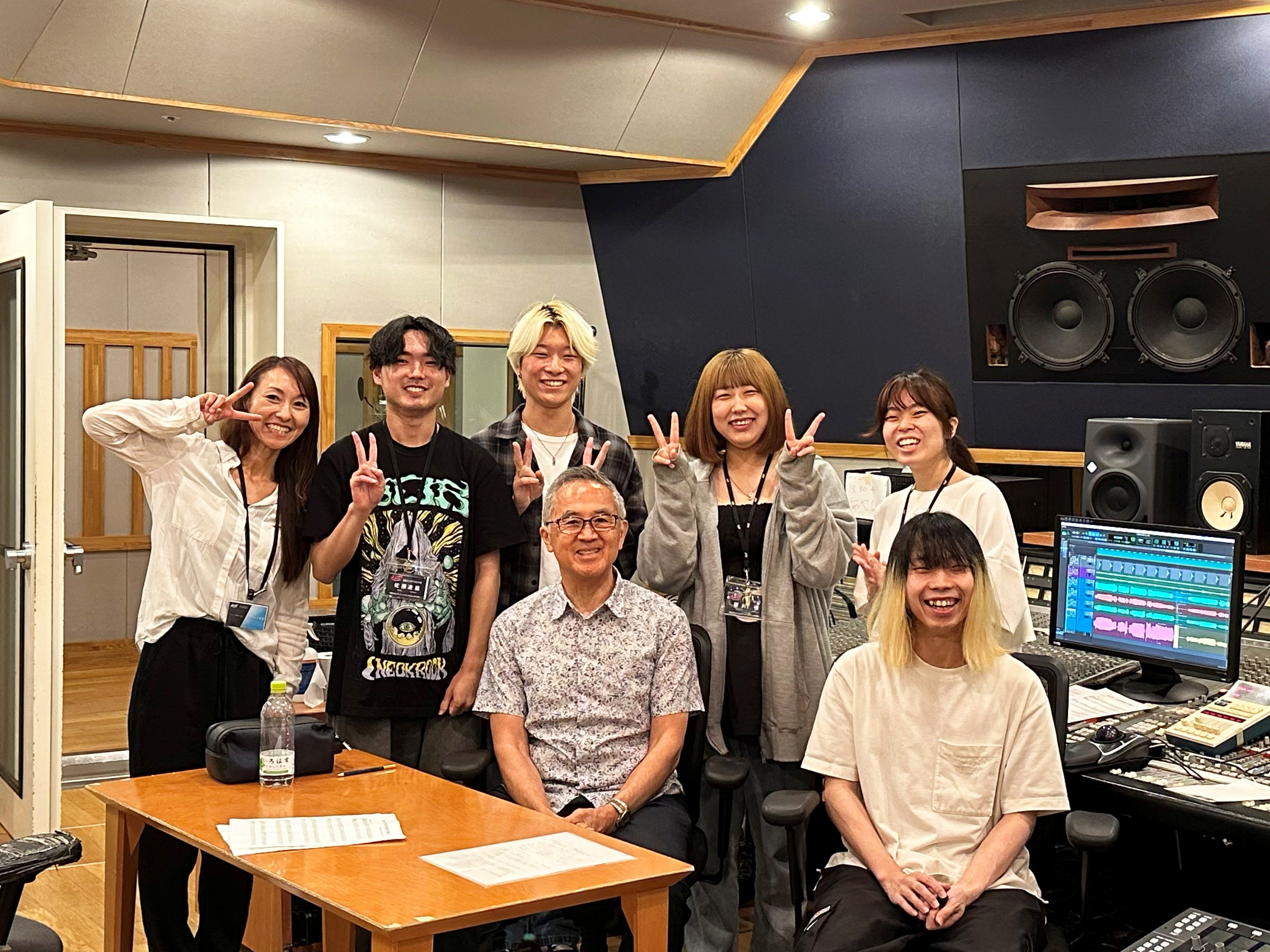 1人1人ブースに入っての録音で、1人目の櫻井惺さんには曲のイメージを理解してもらうために小節を区切って何回も歌ってもらうことになり大変な思いをさせてしまいましたが、マルレーン有美先生の的確な指導もあり、見事に曲全体の雰囲気を形にしてくれました。この複数回のテイクをメモをとりながら見ていた2人目以降は、すんなり録音を進めることができました。翌日には2年生の本間朱莉さんと七浦謙斗さんの録音を行いました。
